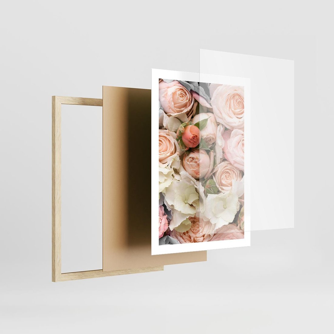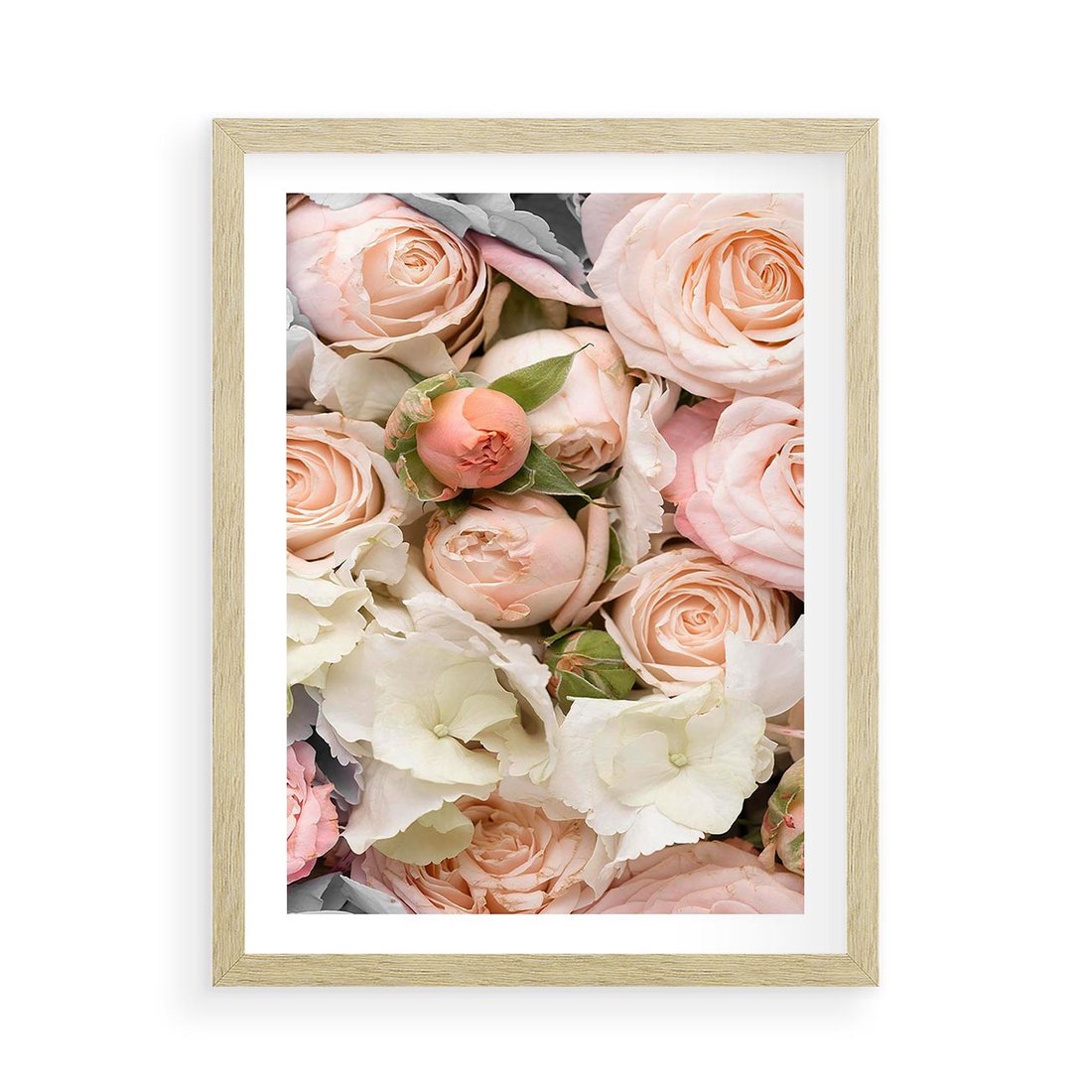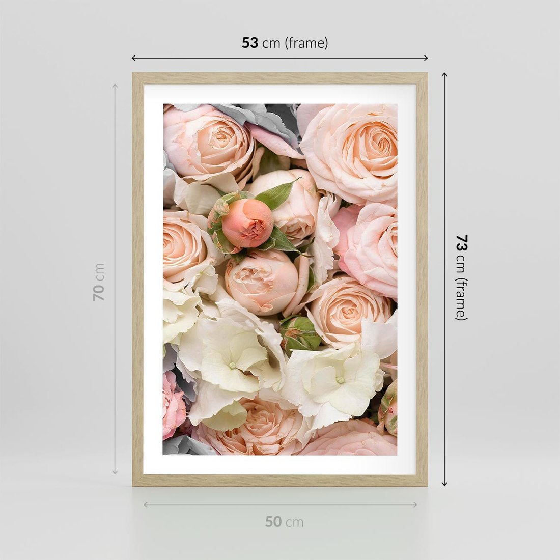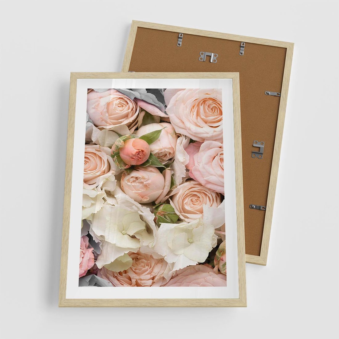 Plakat w ramie 50x70 - Kwiatowy Rarytas: Róże w Herbacianym Zbliżeniu - kwiaty, herbaciane - rama drewno