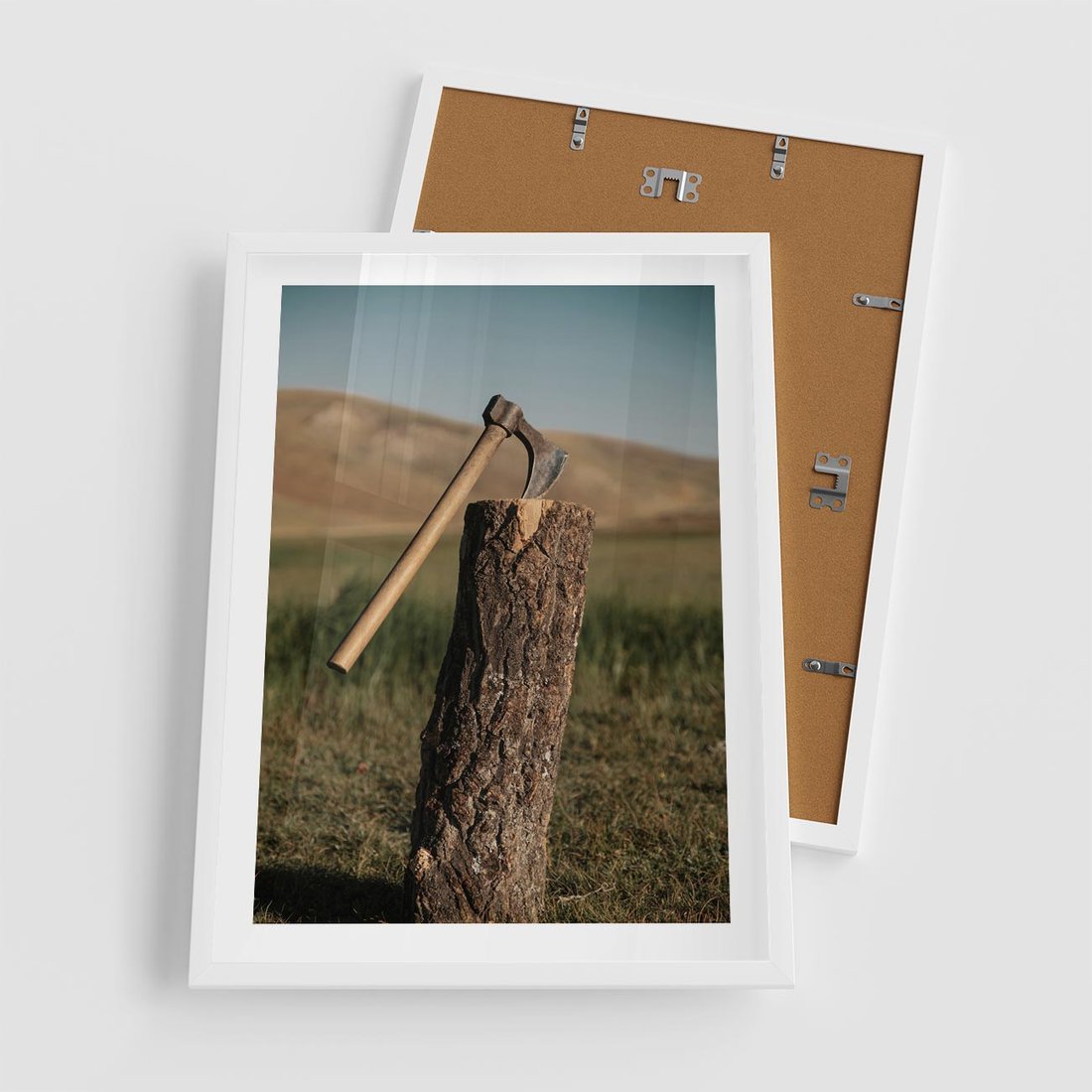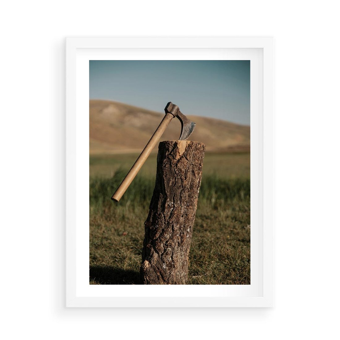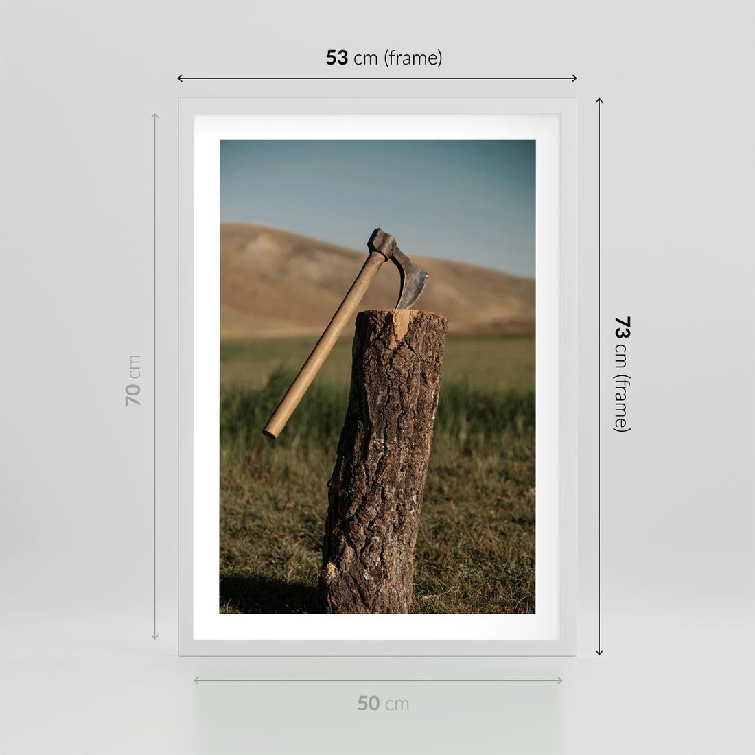 Plakat w ramie 50x70 - Lasowa siła w drewnie - las, siekiera - rama biała