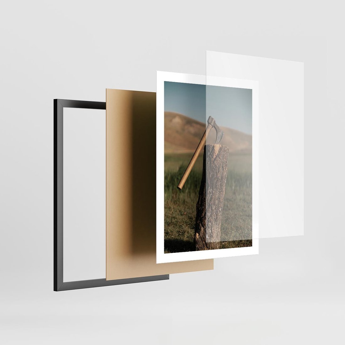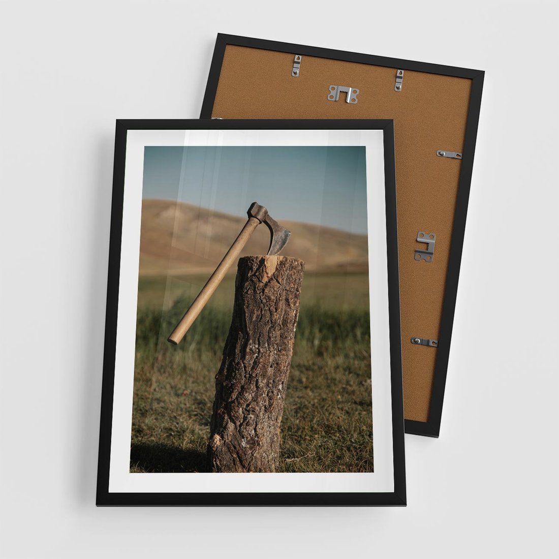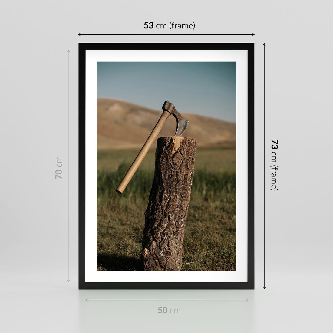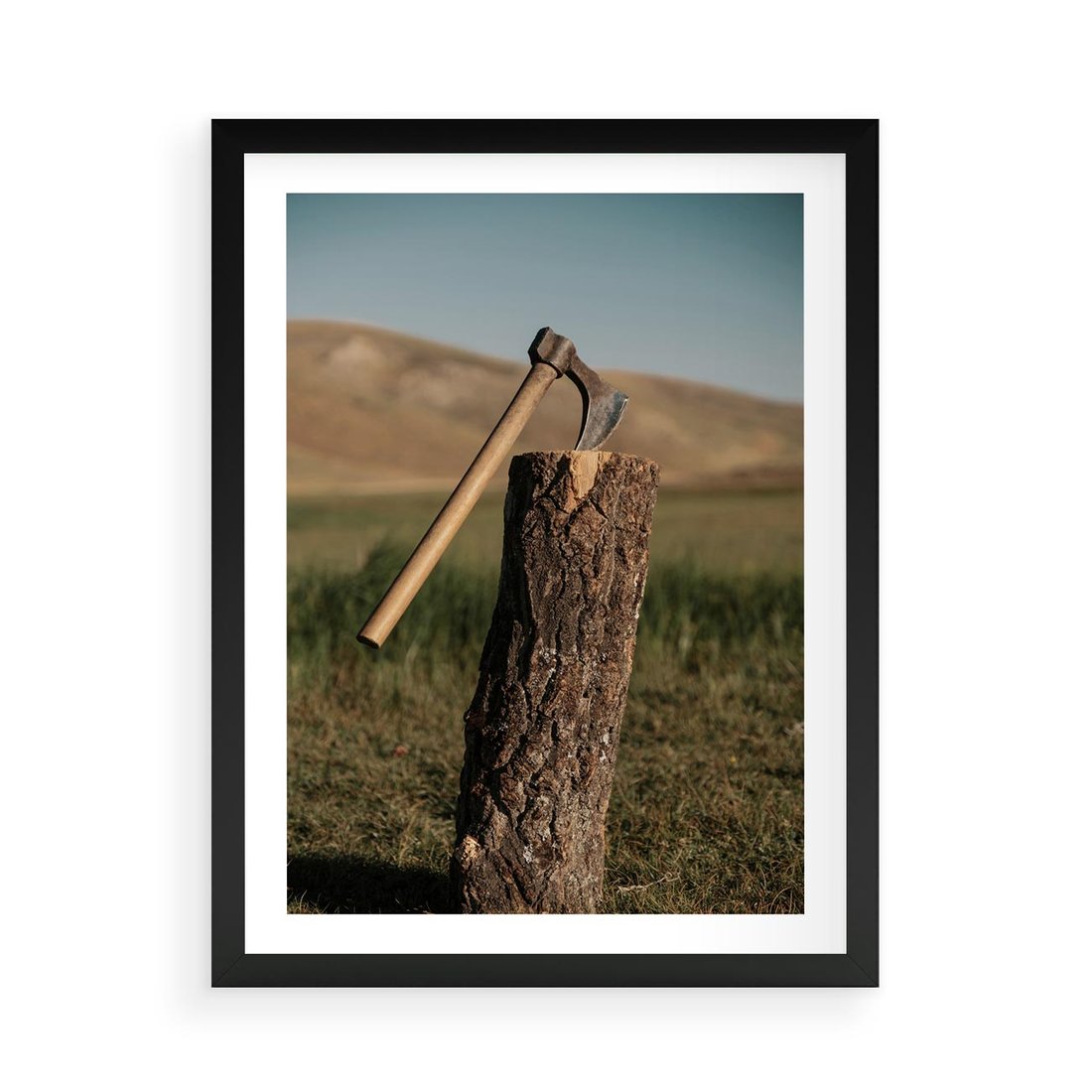 Plakat w ramie 50x70 - Lasowa siła w drewnie - las, siekiera - rama czarna