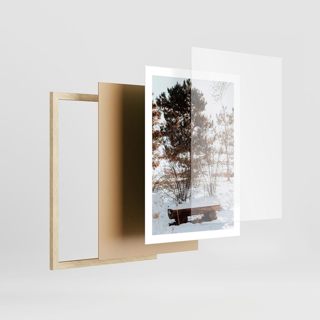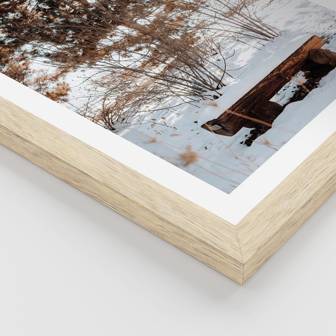 Plakat w ramie 50x70 - Ławka Pod Śniegiem - zimowy pejzaż, ławka pod śniegiem - rama drewno