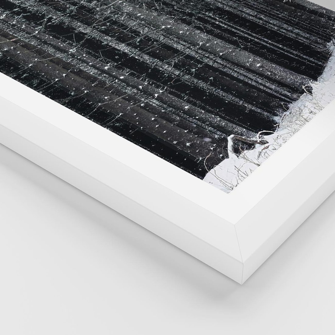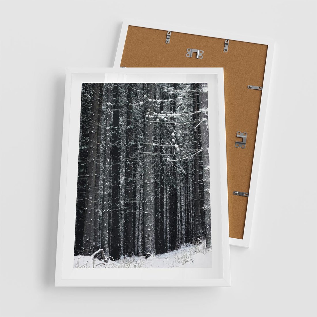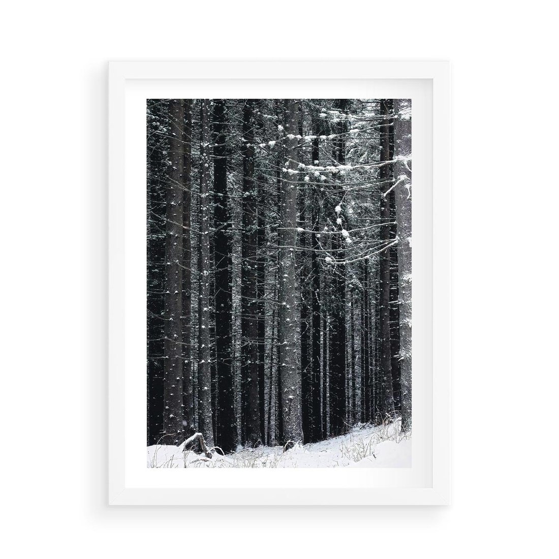 Plakat w ramie 50x70 - Leśna Cisza: Malowniczy Pejzaż Zimą - las zimą, ośnieżone pnie drzew - rama biała