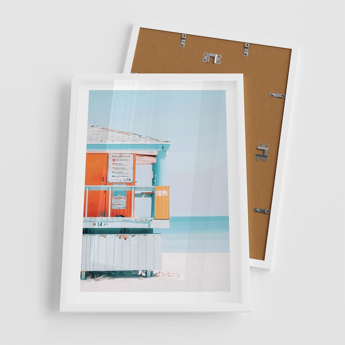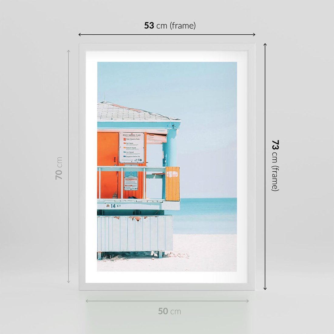 Plakat w ramie 50x70 - Letnia Idylla - plaża, domek na plaży - rama biała