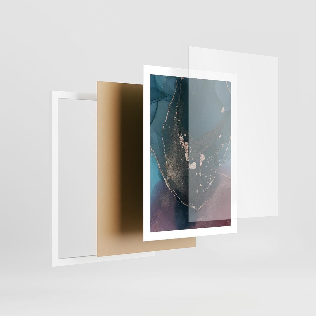 Obraz przedstawia elegancki zestaw kolorów i materiałów, w tym marmur o odcieniach granatu i fioletu, które są urozmaicone złotymi elementami. To dzieło sztuki doskonale wpisuje się w nowoczesne wnętrza o luksusowym charakterze.