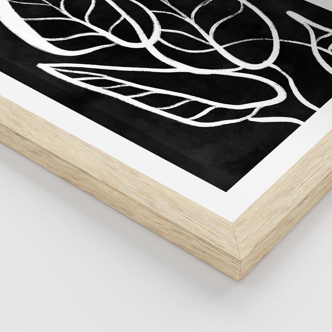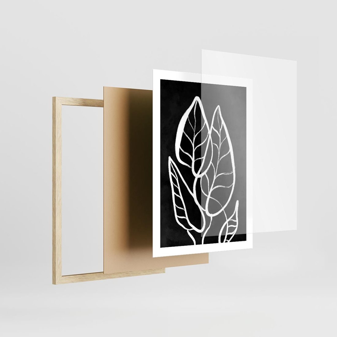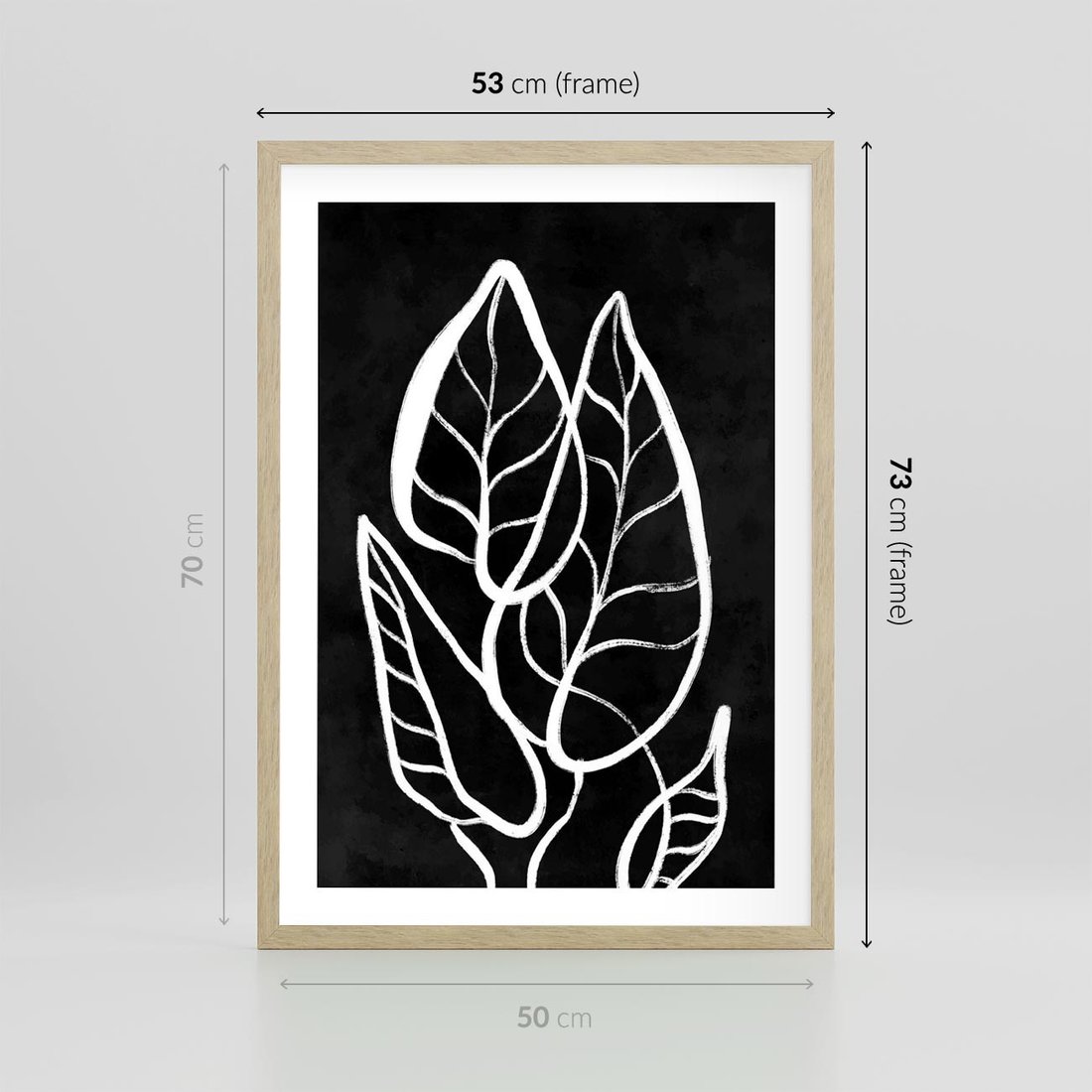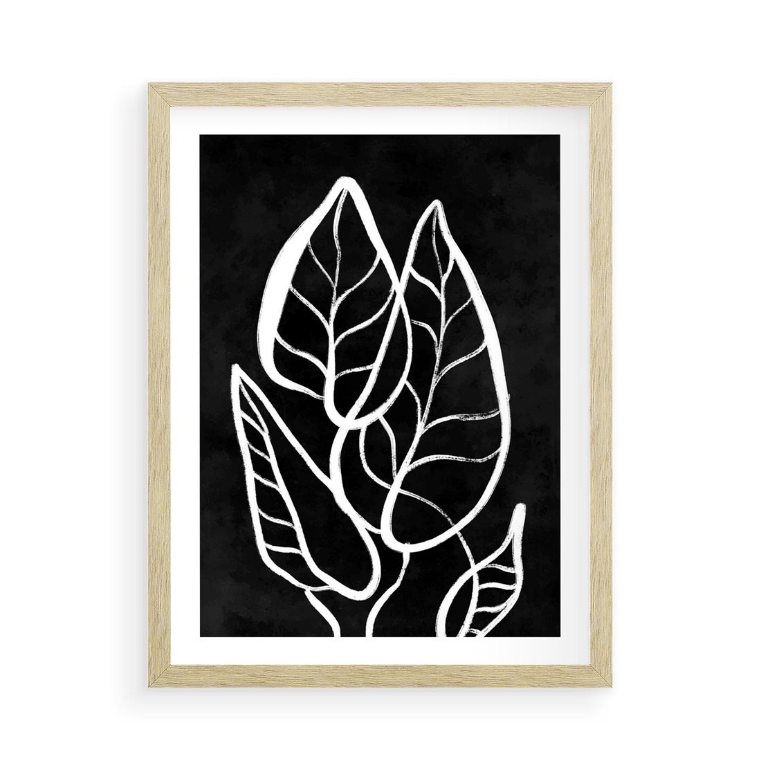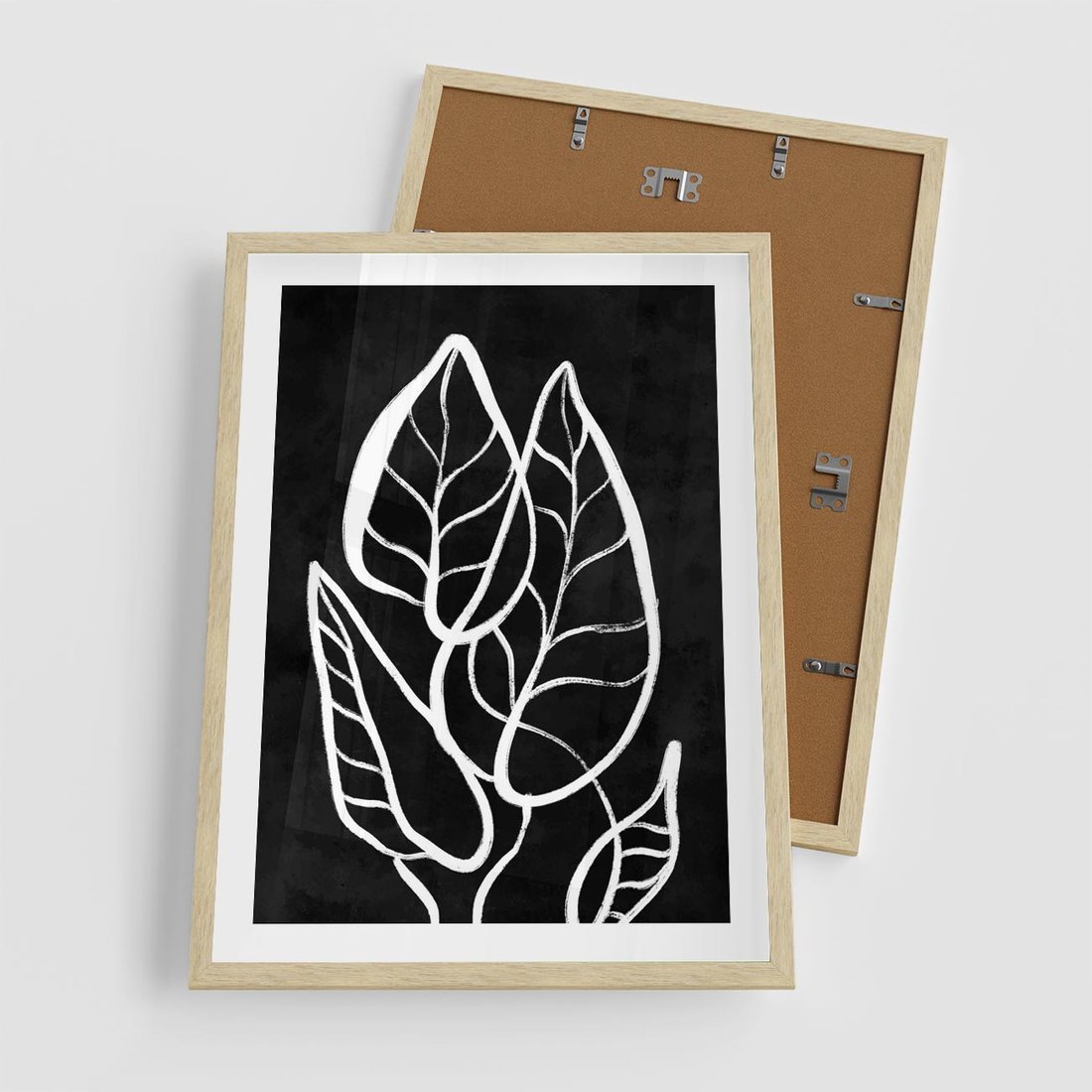 Biały szkic liści na głębokim czarnym tle tworzy mroczny minimalizm, który przyciąga uwagę i nadaje elegancji każdemu wnętrzu.