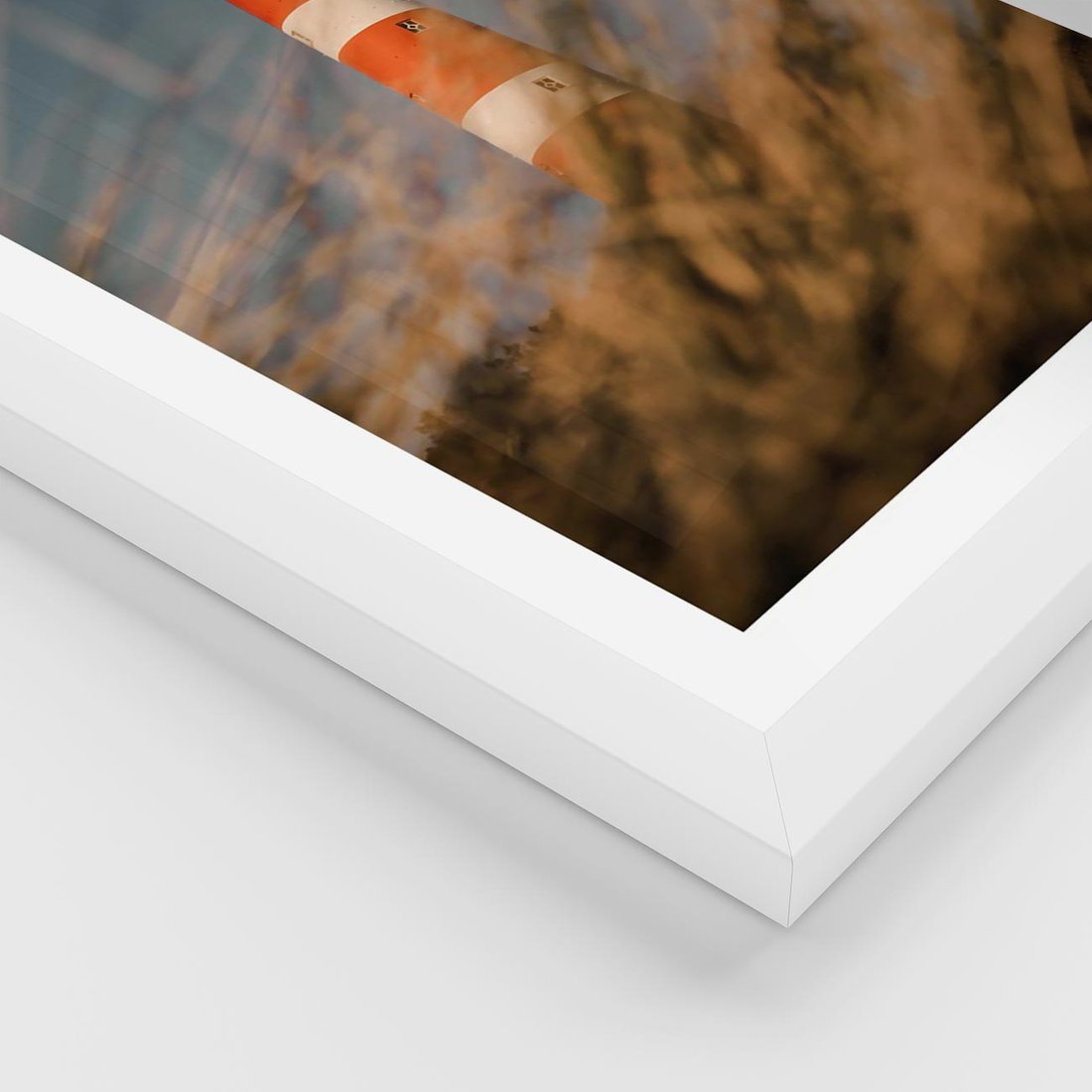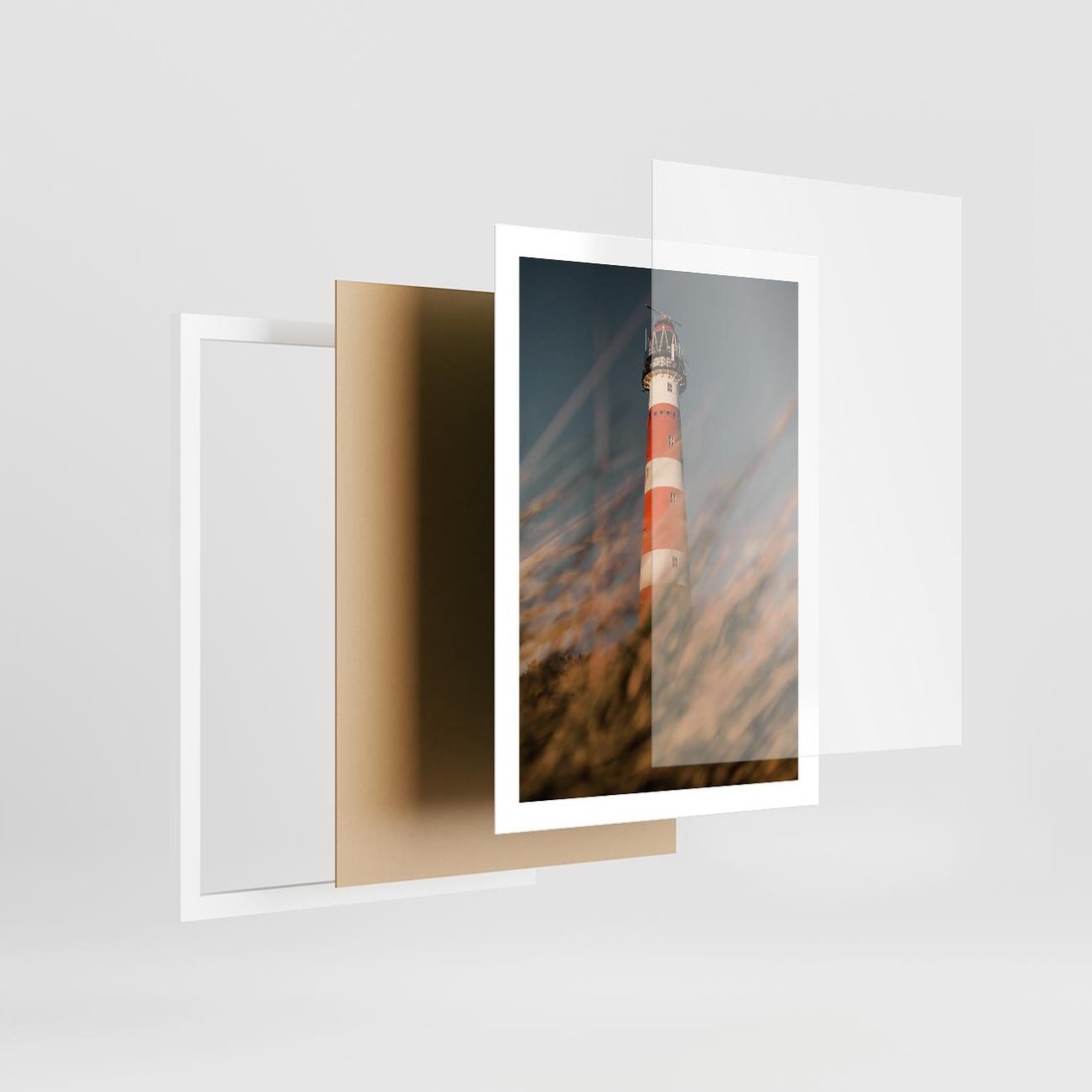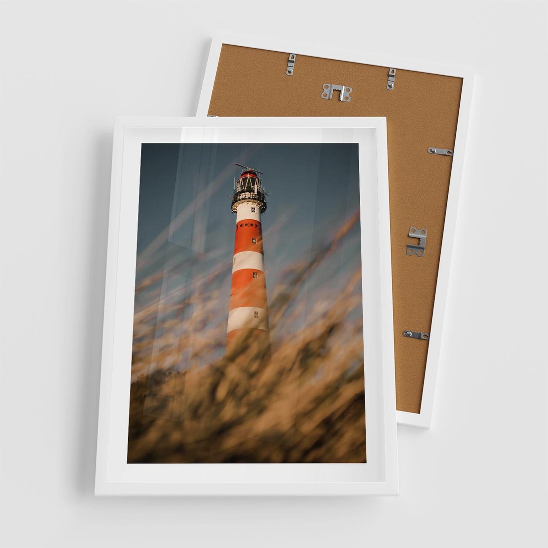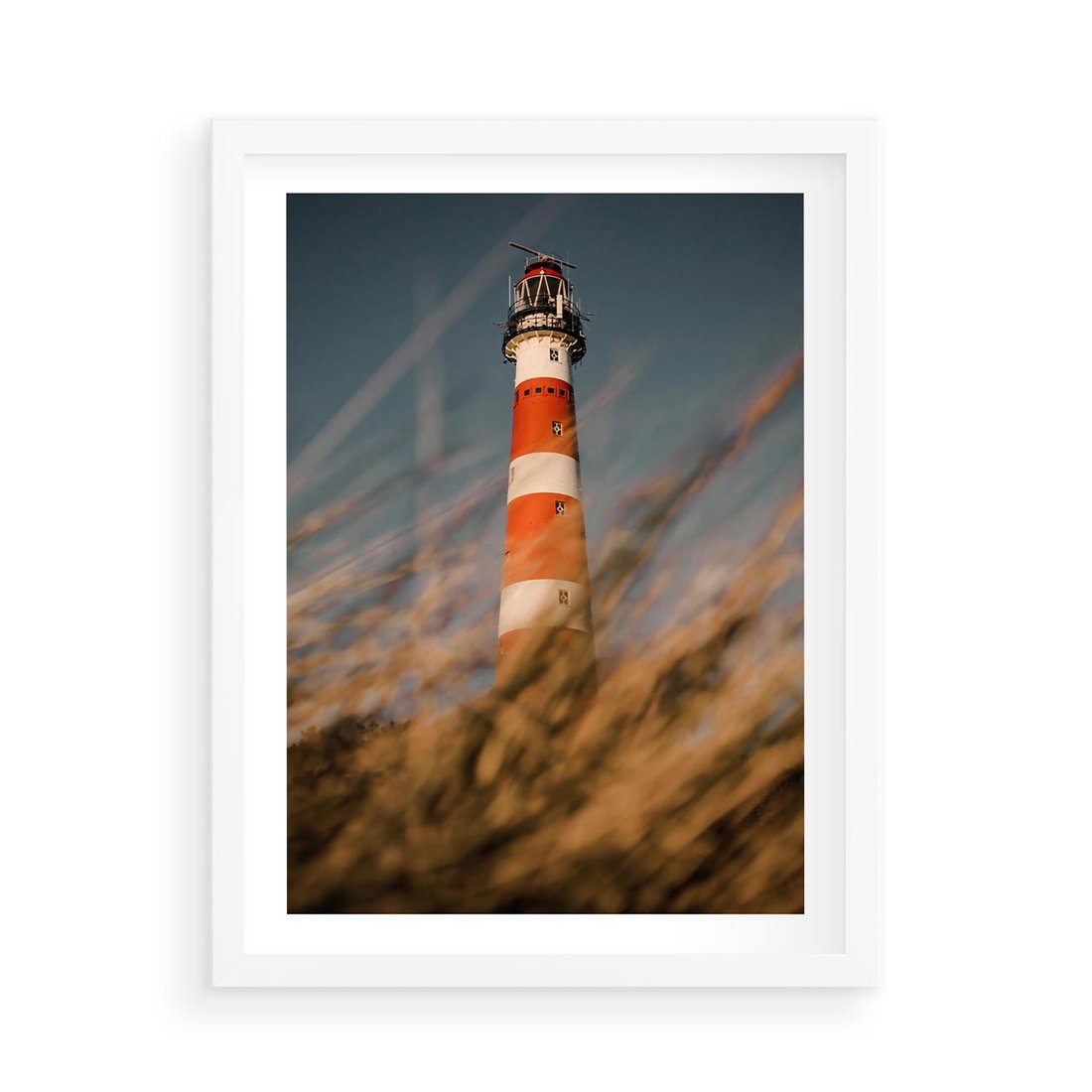 Plakat w ramie 50x70 - Magia nadmorskiego światła - latarnia morska, ujęcie z za trawy - rama biała