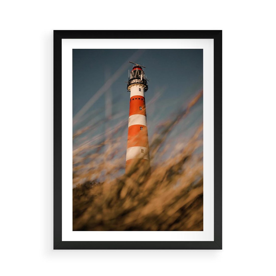 Na obrazie widoczna jest malownicza latarnia morska, przedstawiona z perspektywy ukrytej za wysoką trawą, co nadaje mu urokliwego i tajemniczego charakteru. Całość emanuje nadmorskim klimatem, co sprawia, że ten obraz idealnie pasuje do wnętrza o tematyce nadmorskiej, jak przytulna plażowa chatka nad oceanem lub jadalnia w stylu marynistycznym.