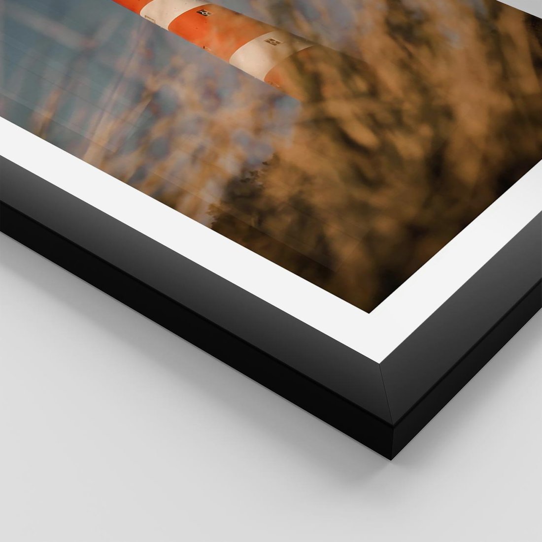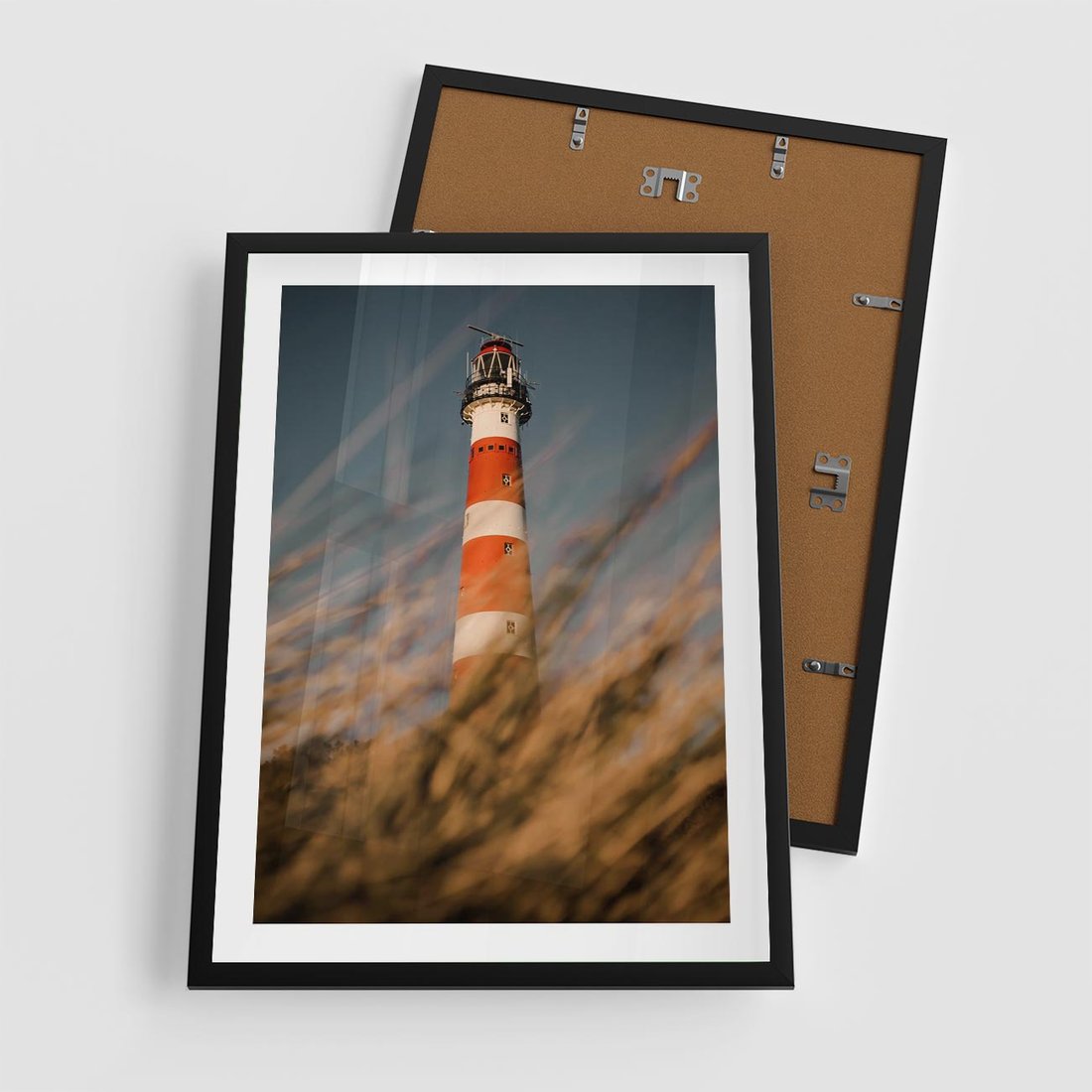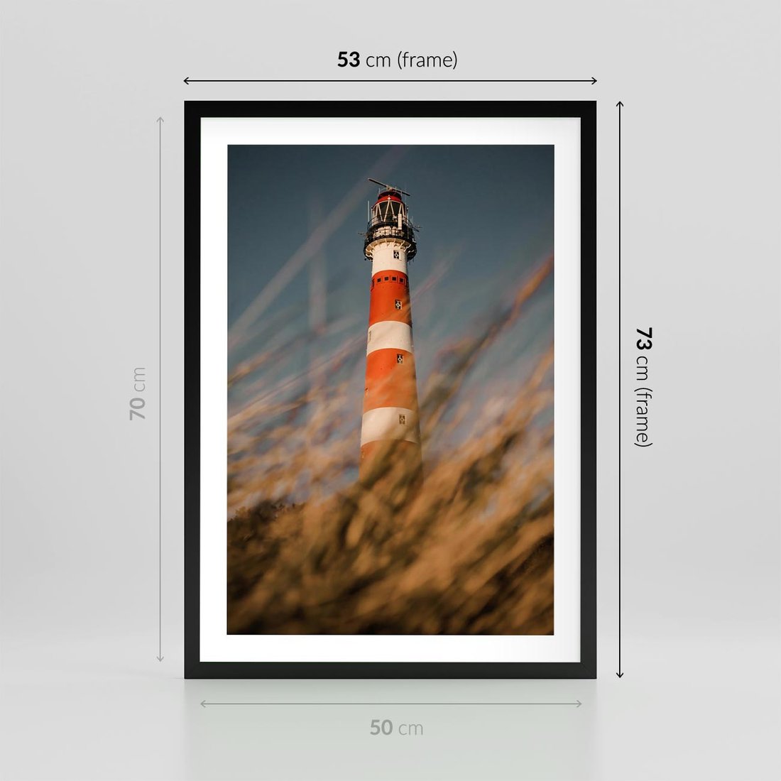 Plakat w ramie 50x70 - Magia nadmorskiego światła - latarnia morska, ujęcie z za trawy - rama czarna