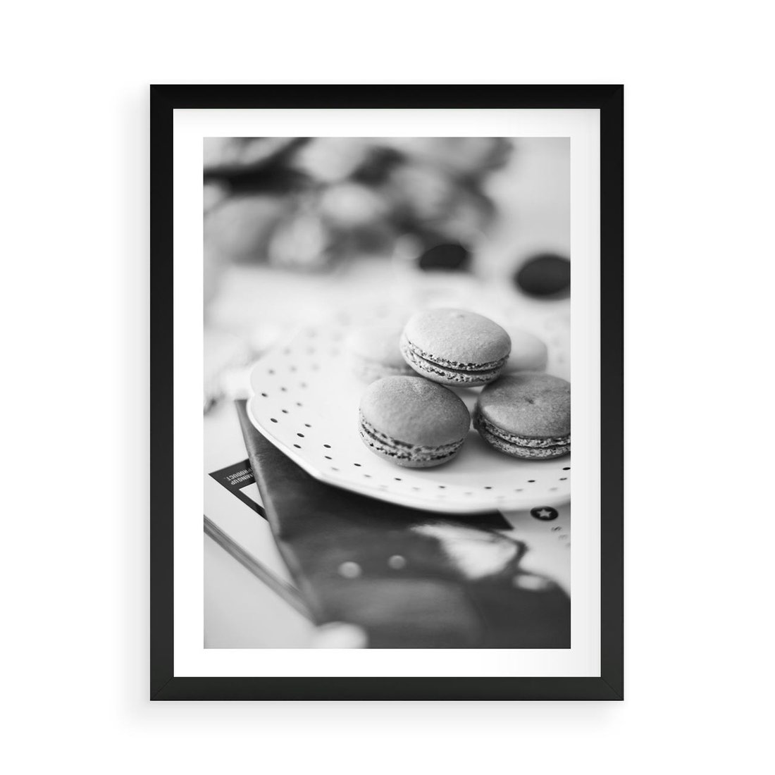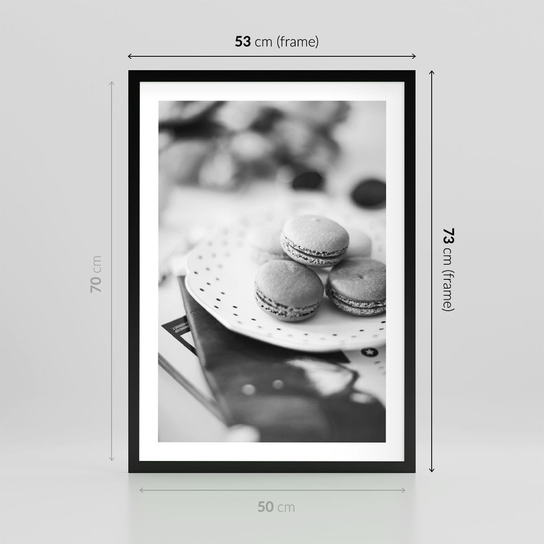 Ta czarno-biała fotografia jest artystycznym zbliżeniem ciasteczek makaronik na talerzu. Zdjęcie oddaje teksturę i szczegóły tych smakowitych wypieków w sposób elegancki i klasyczny. Czarno-biała paleta kolorów nadaje fotografii wyrafinowanego wyglądu i podkreśla estetykę tych delikatnych słodkości. To doskonały plakat do nowoczesnych wnętrz, które cenią sobie sztukę w fotografii żywności i estetykę kulinarnej przyjemności.