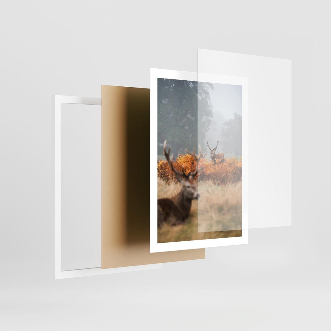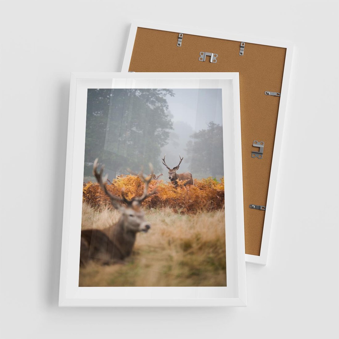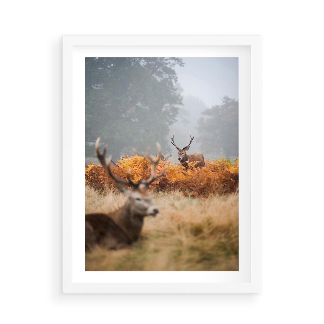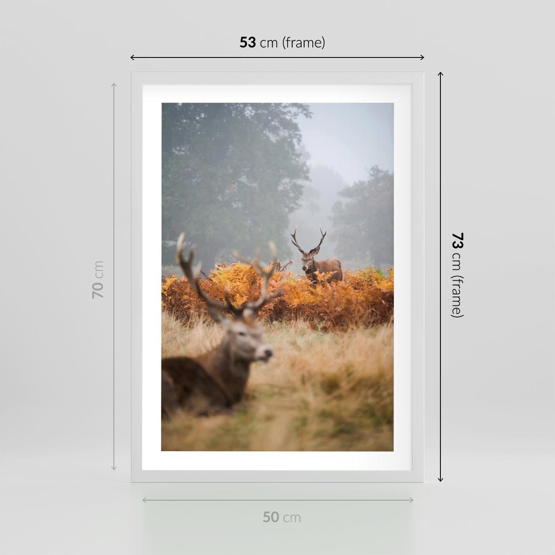 Plakat w ramie 50x70 - Malownicza Harmonia - jelenie, jesień - rama biała