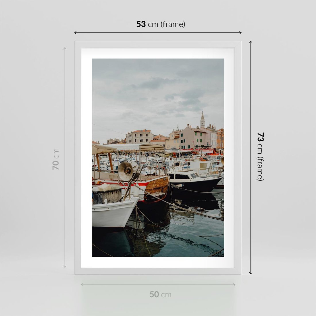 Plakat w ramie 50x70 - Malowniczy Krajobraz Morski - morze, łódki - rama biała