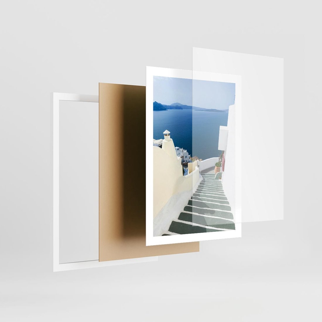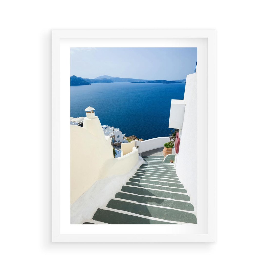 Plakat w ramie 50x70 - Malowniczy urok wyspy - Santorini, schodki - rama biała