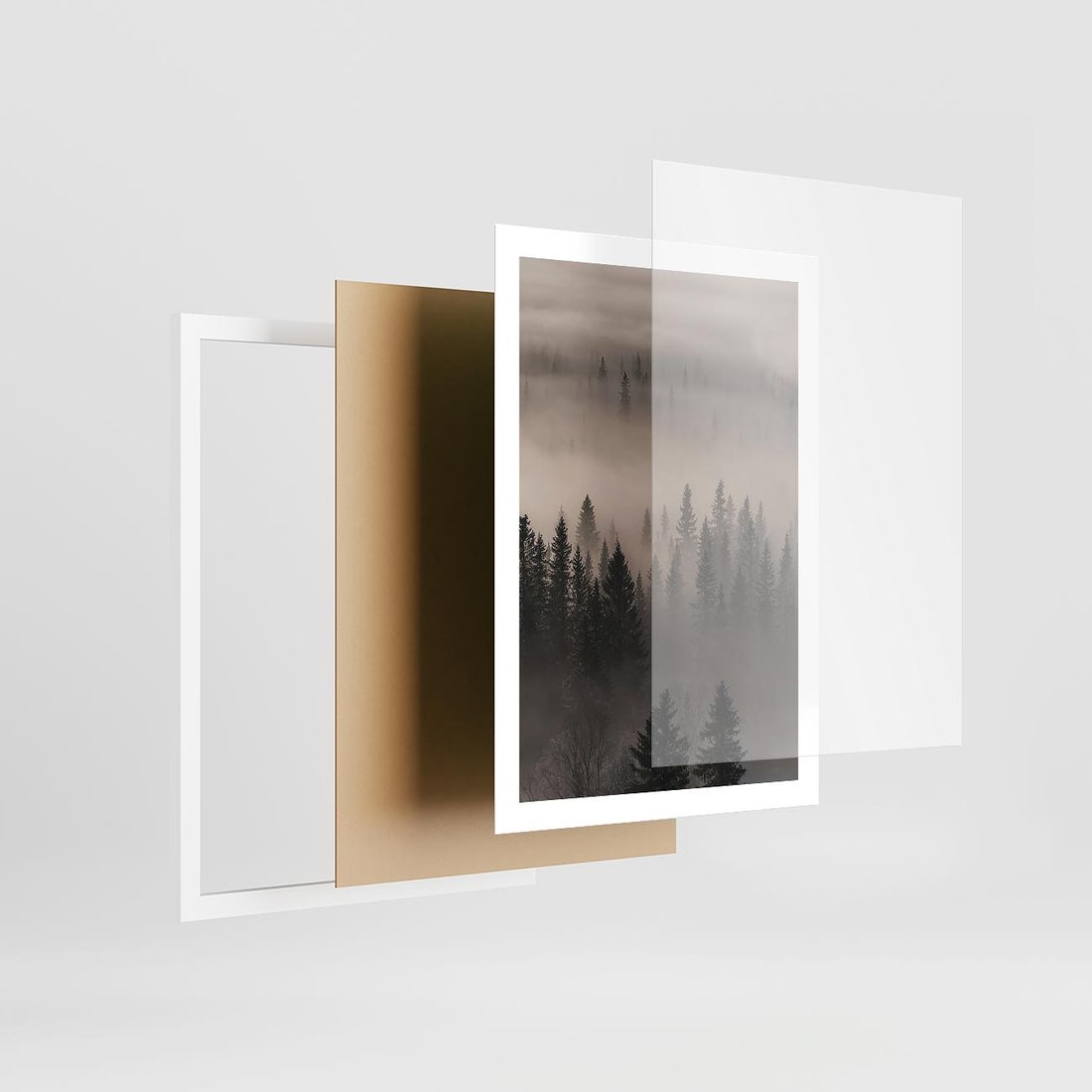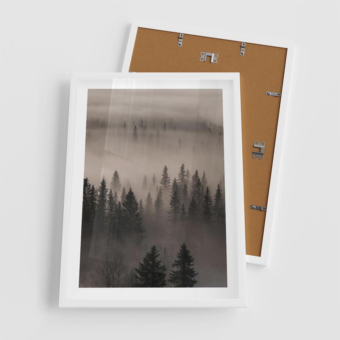 Plakat w ramie 50x70 - Mglista Opowieść Lasu - las, mgła - rama biała