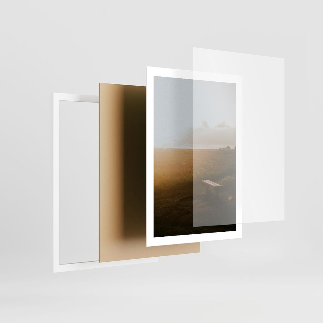 Plakat w ramie 50x70 - Mglisty zachód słońca na ławeczce - mgła, zachód - rama biała