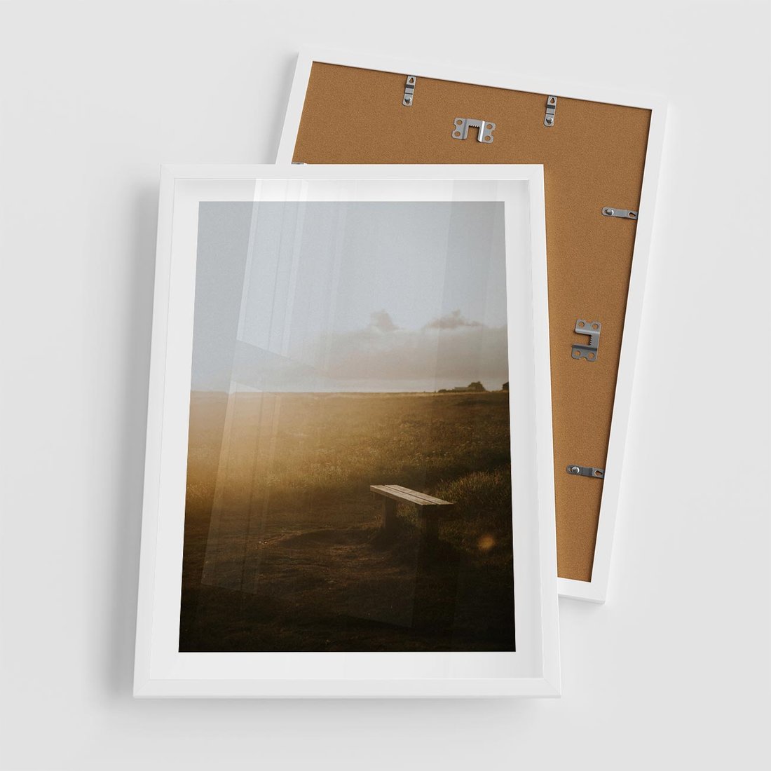 - Plakat w ramie 50x70 - Mglisty zachód słońca na ławeczce