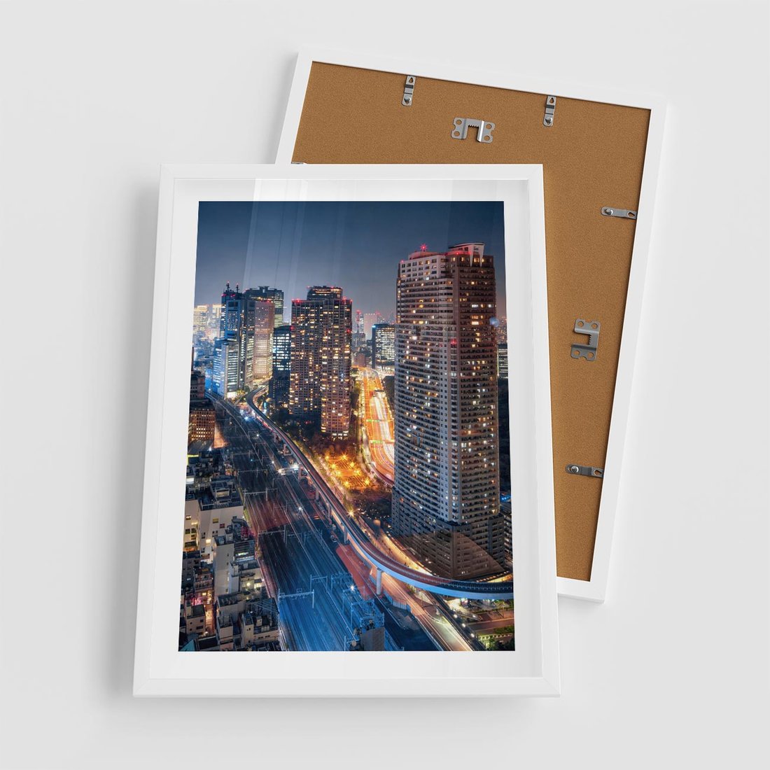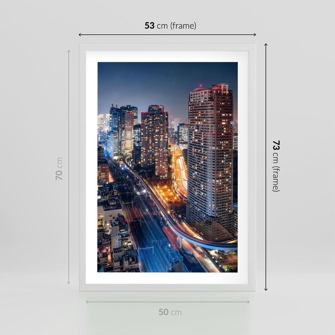 Plakat w ramie 50x70 - Miasto nocą z wieżowcami w tle - miasto, nocą - rama biała