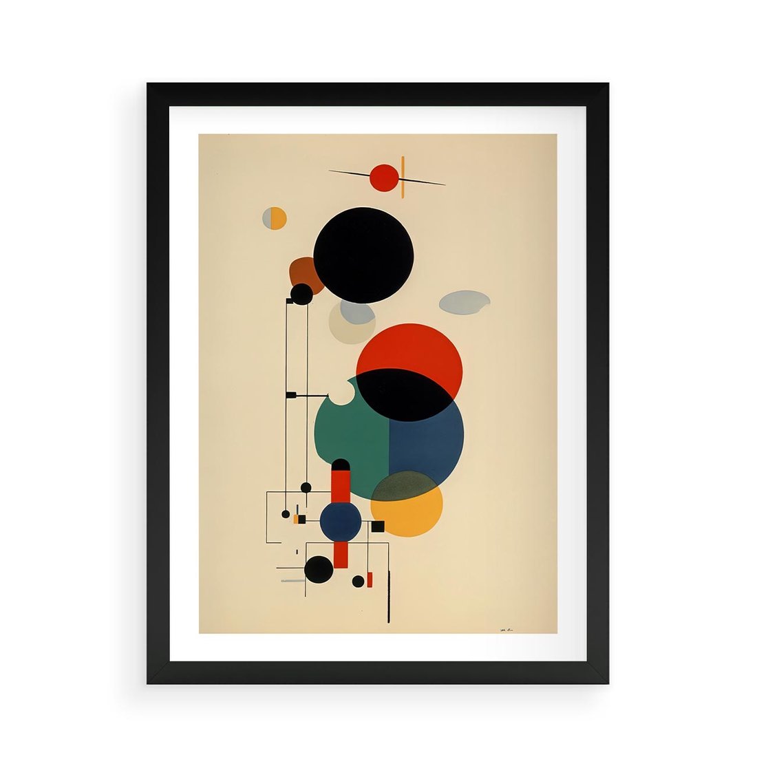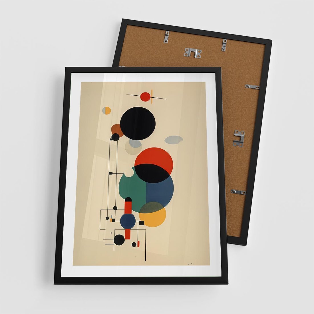 Ta abstrakcyjna geometryczna kompozycja inspirowana stylem Kandinsky'ego łączy w sobie elementy kół i linii, tworząc dynamiczną i ekspresyjną wizję. Ten wpływ dodaje głębi i emocji temu obrazowi.