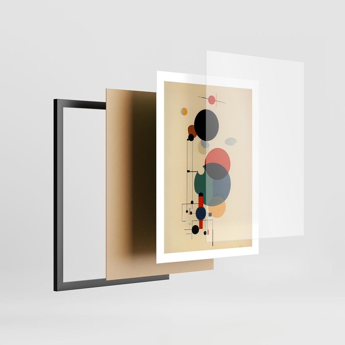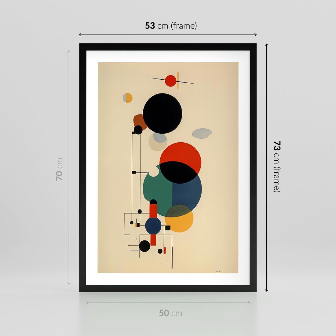 Plakat w ramie 50x70 - Migocące Impresje Odniesień - abstrakcyjna geometryczna kompozycja, koła linie - rama czarna