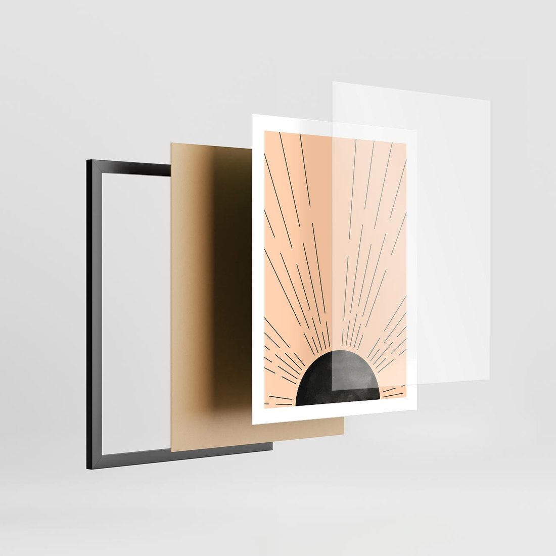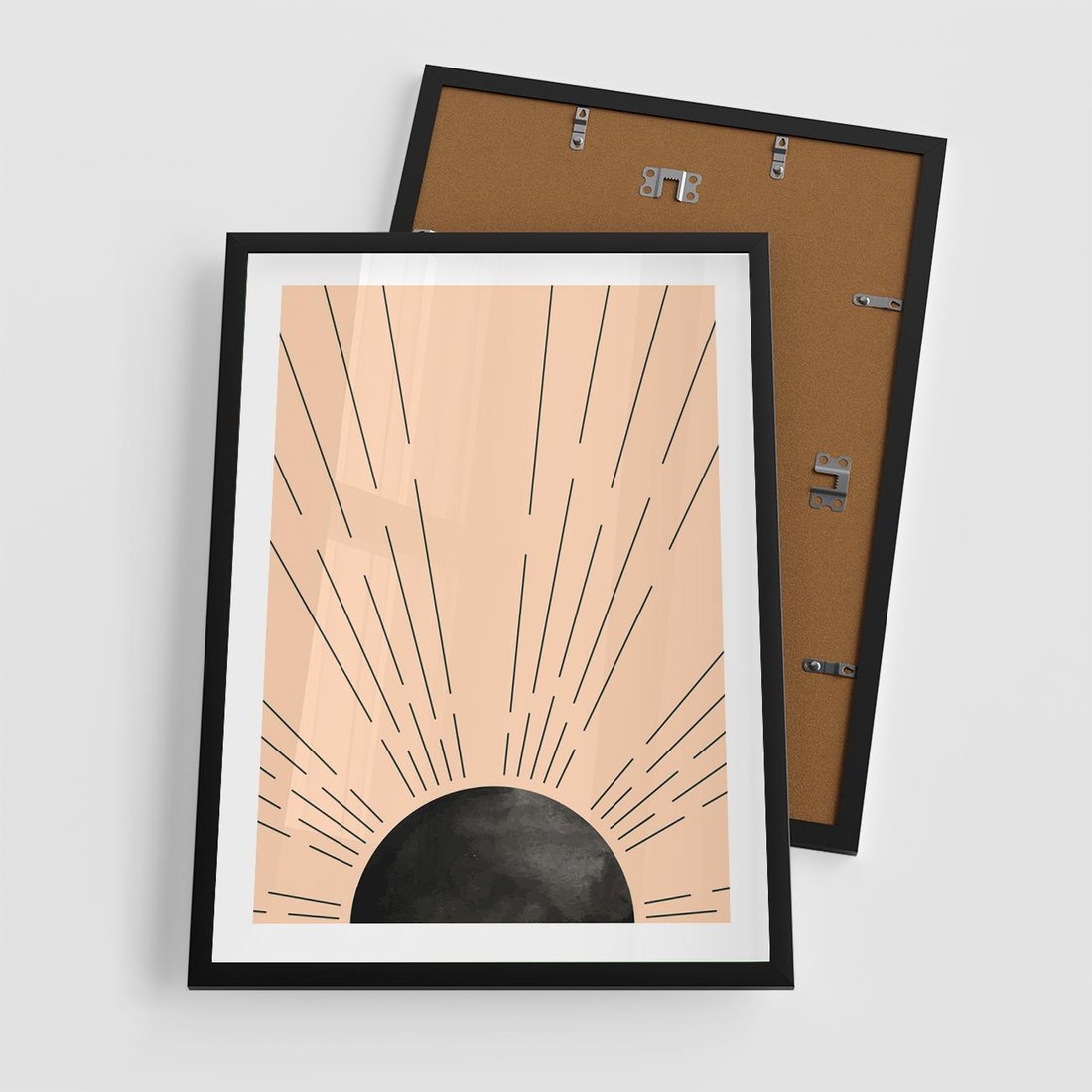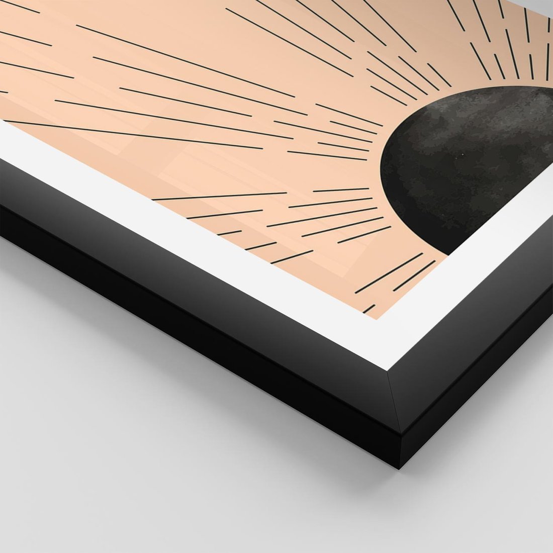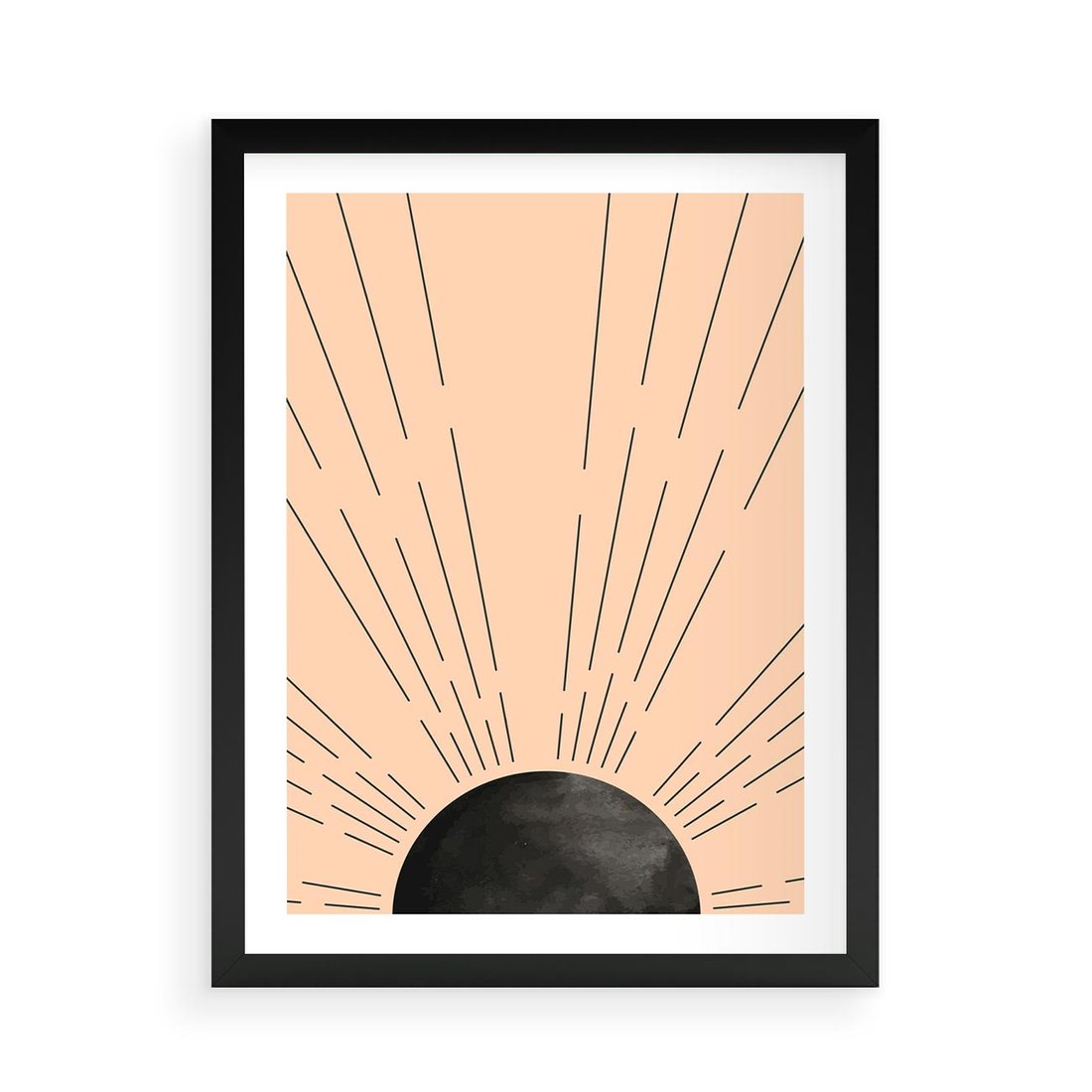 Plakat w ramie 50x70 - Migocące Kształty Promieni - boho czarne słońce, nowoczesna grafika - rama czarna