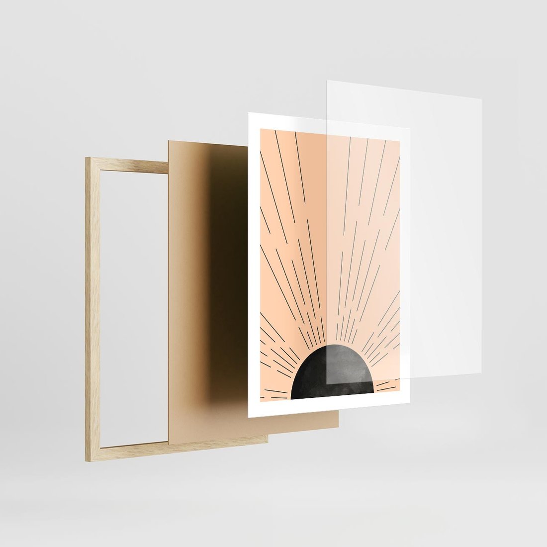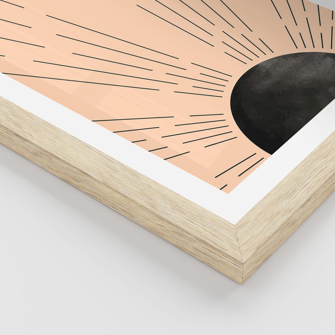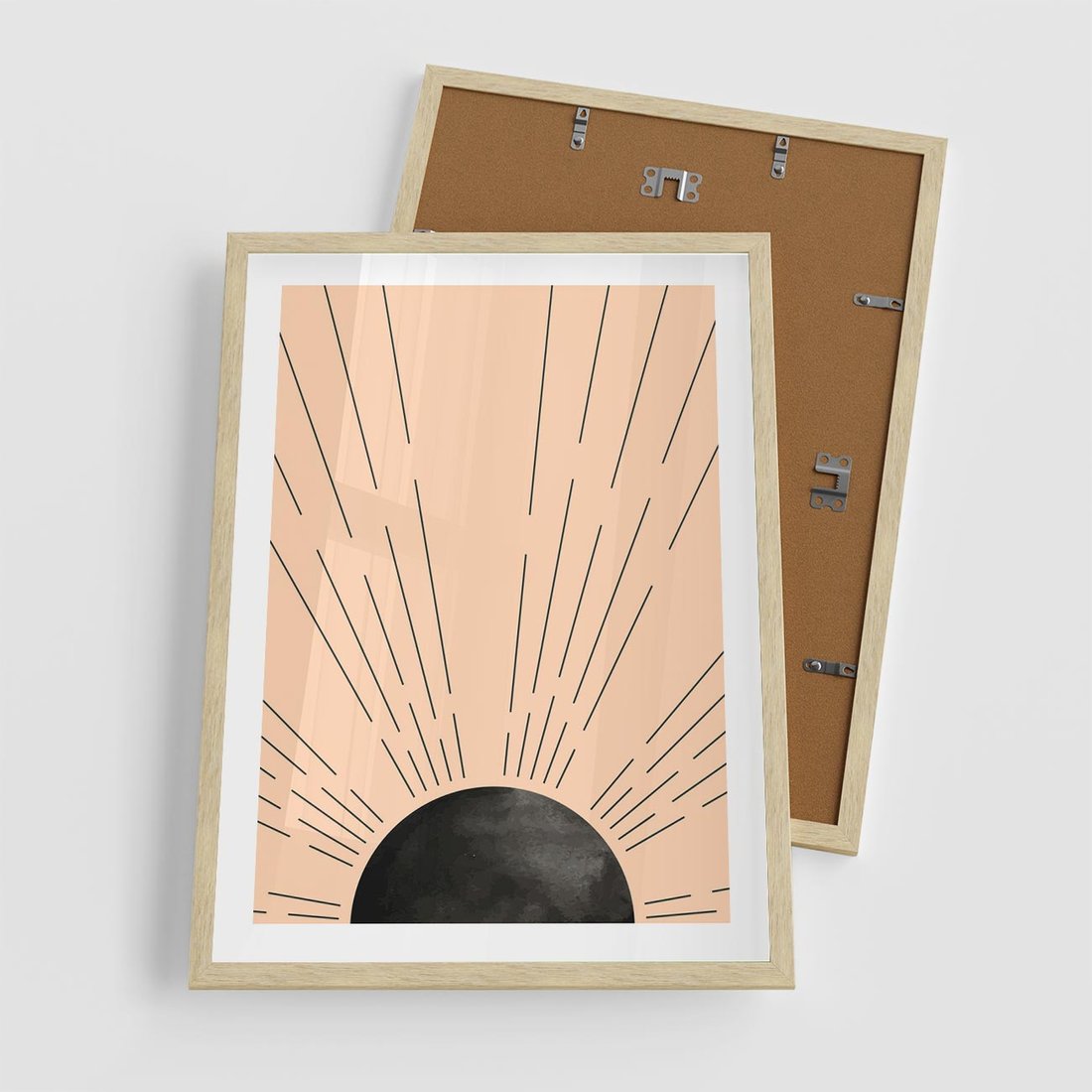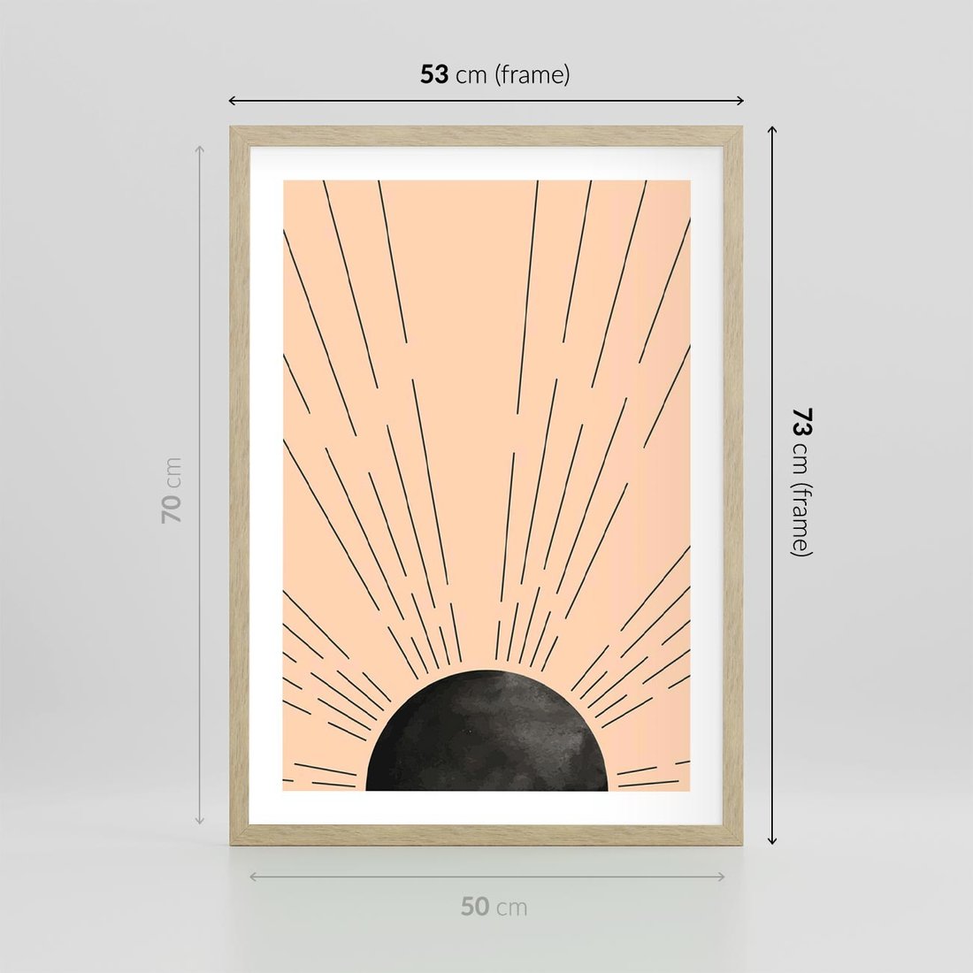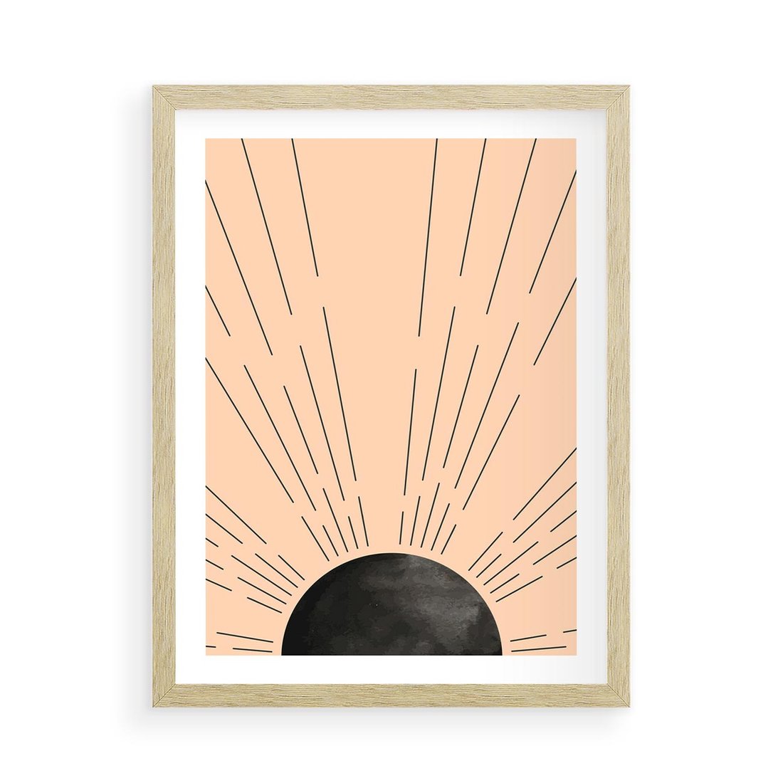 Plakat w ramie 50x70 - Migocące Kształty Promieni - boho czarne słońce, nowoczesna grafika - rama drewno