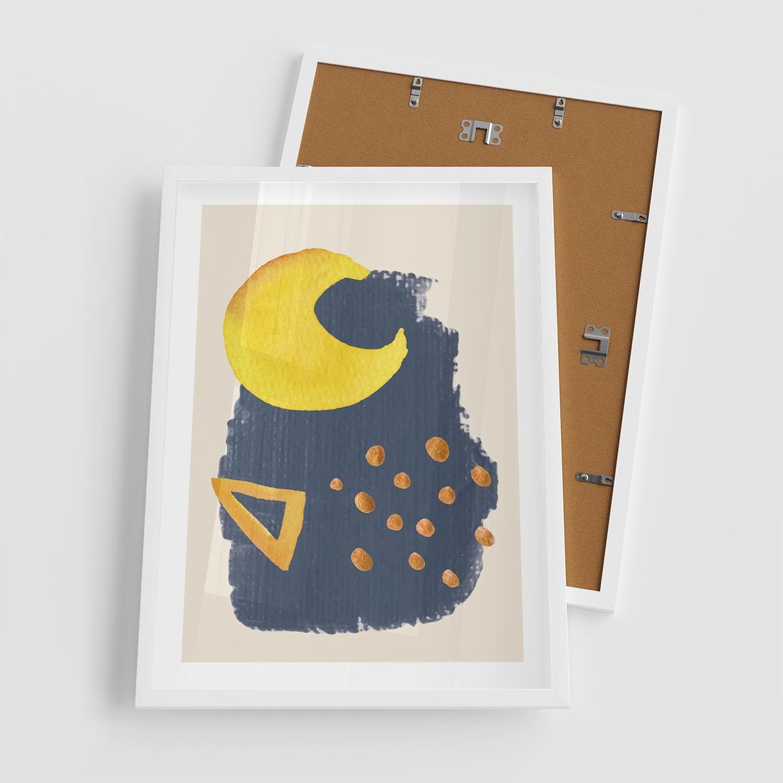 Nasz plakat to abstrakcyjna akwarelowa plama w intensywnym granatowym odcieniu, z tłem przedstawiającym księżyc. To wyjątkowe dzieło sztuki wprowadzi tajemniczą i mistyczną atmosferę do Twojej przestrzeni, zachwycając wyrazistym kontrastem i emocjonalnym oddziaływaniem.