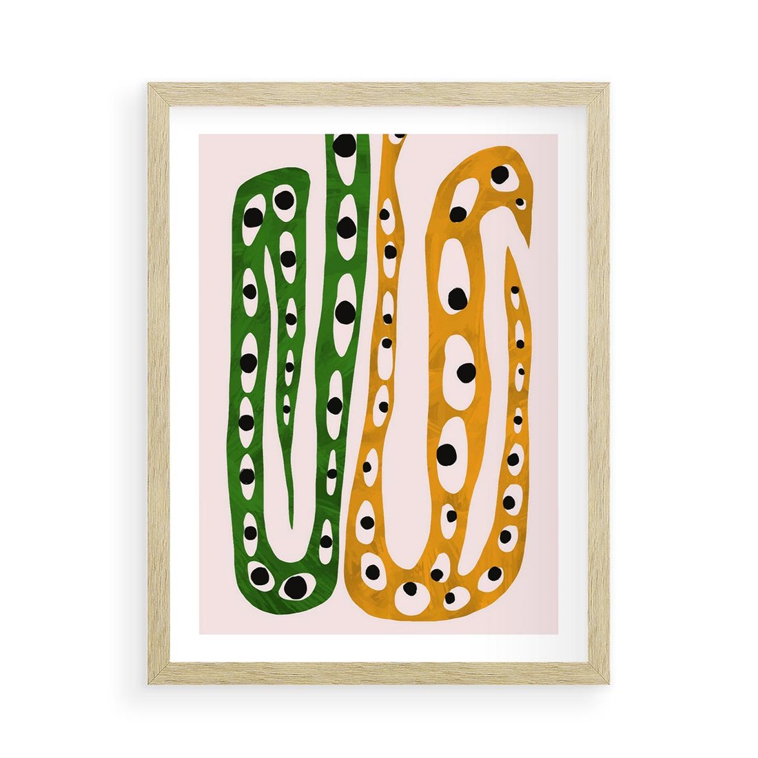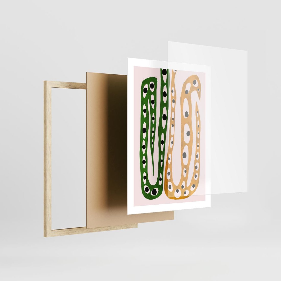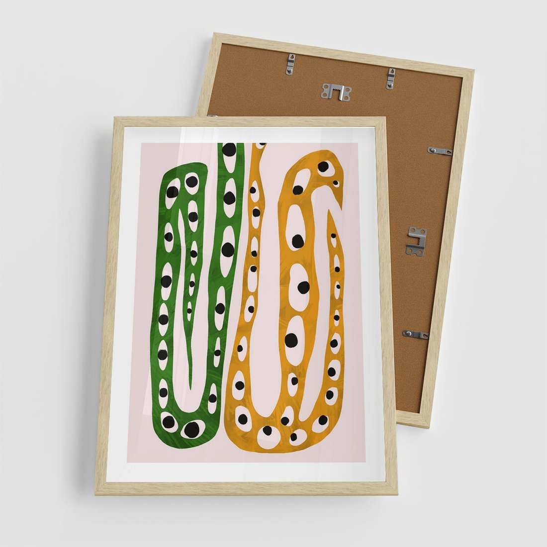 Nasz abstrakcyjny obraz przeniesie Cię w tajemniczy świat dziwnych kształtów przypominających zwinne węże. Soczyste żółte i zielone barwy ożywiają kompozycję, tworząc dynamiczny kontrast. To wyjątkowy akcent artystyczny, który dodaje charakteru i zaskoczenia każdej przestrzeni.