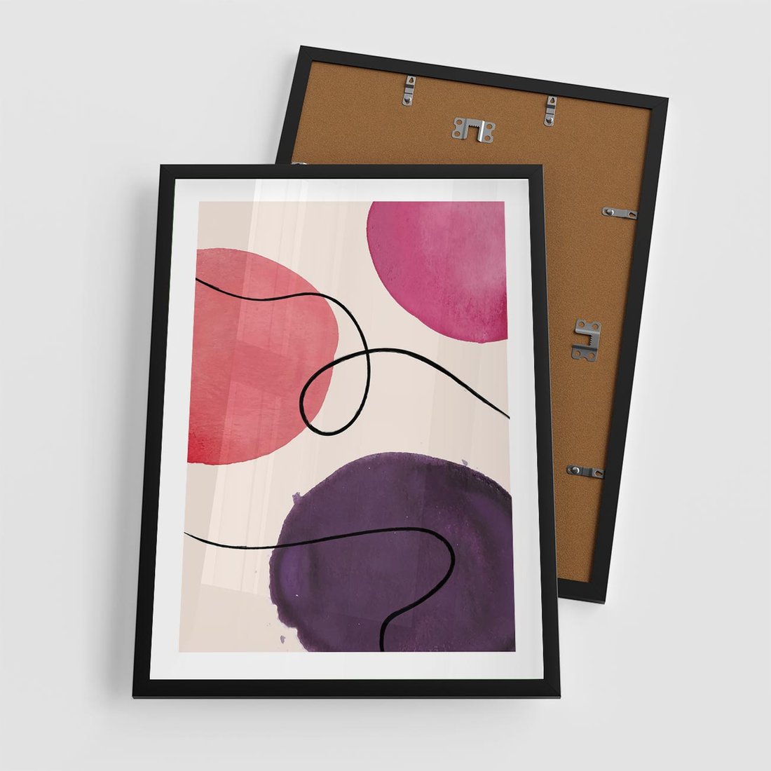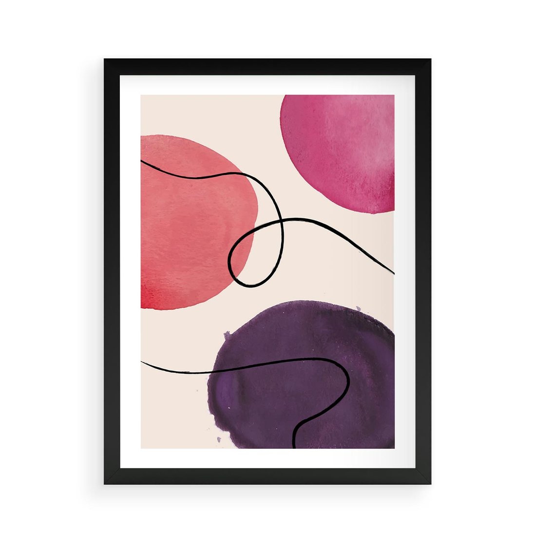 Ten obraz emanuje energią dzięki abstrakcyjnym akwarelowym plamom i nieregularnym liniom, tworząc chaos w kompozycji. Odcienie fioletu i różu dodają mu wyrazistości.