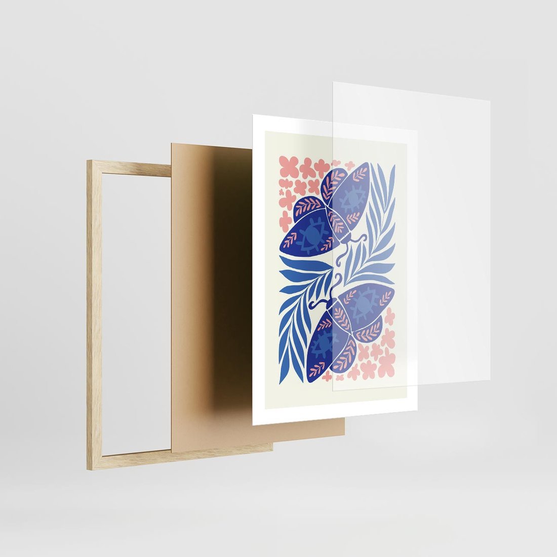 Ten nowoczesny plakat przedstawia abstrakcyjne spotkanie między kwiatami a ćmami, łącząc białe tło z delikatnym pastelowym różem i granatem. Sztuka ta tworzy niezwykłe połączenie natury i abstrakcji, zachęcając do refleksji nad relacjami między różnymi elementami świata.