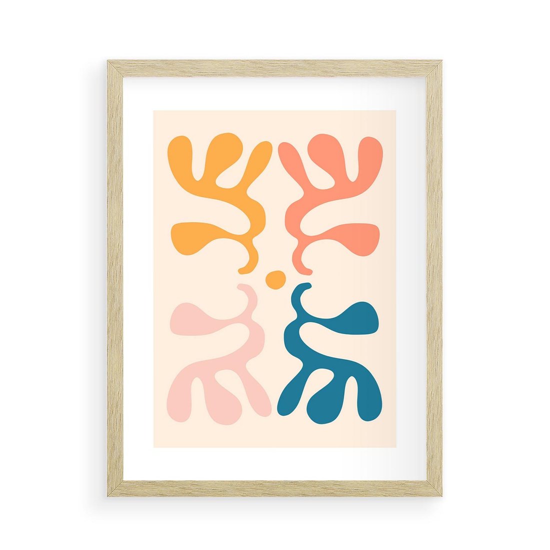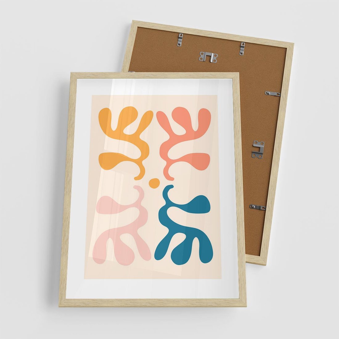 Ten nowoczesny plakat przedstawia abstrakcyjne, dziwne formy w delikatnych pastelowych kolorach. Kompozycja tworzy interesujący kontrast między nowoczesnym stylem a subtelnością kolorów, dodając unikalnego charakteru do przestrzeni.