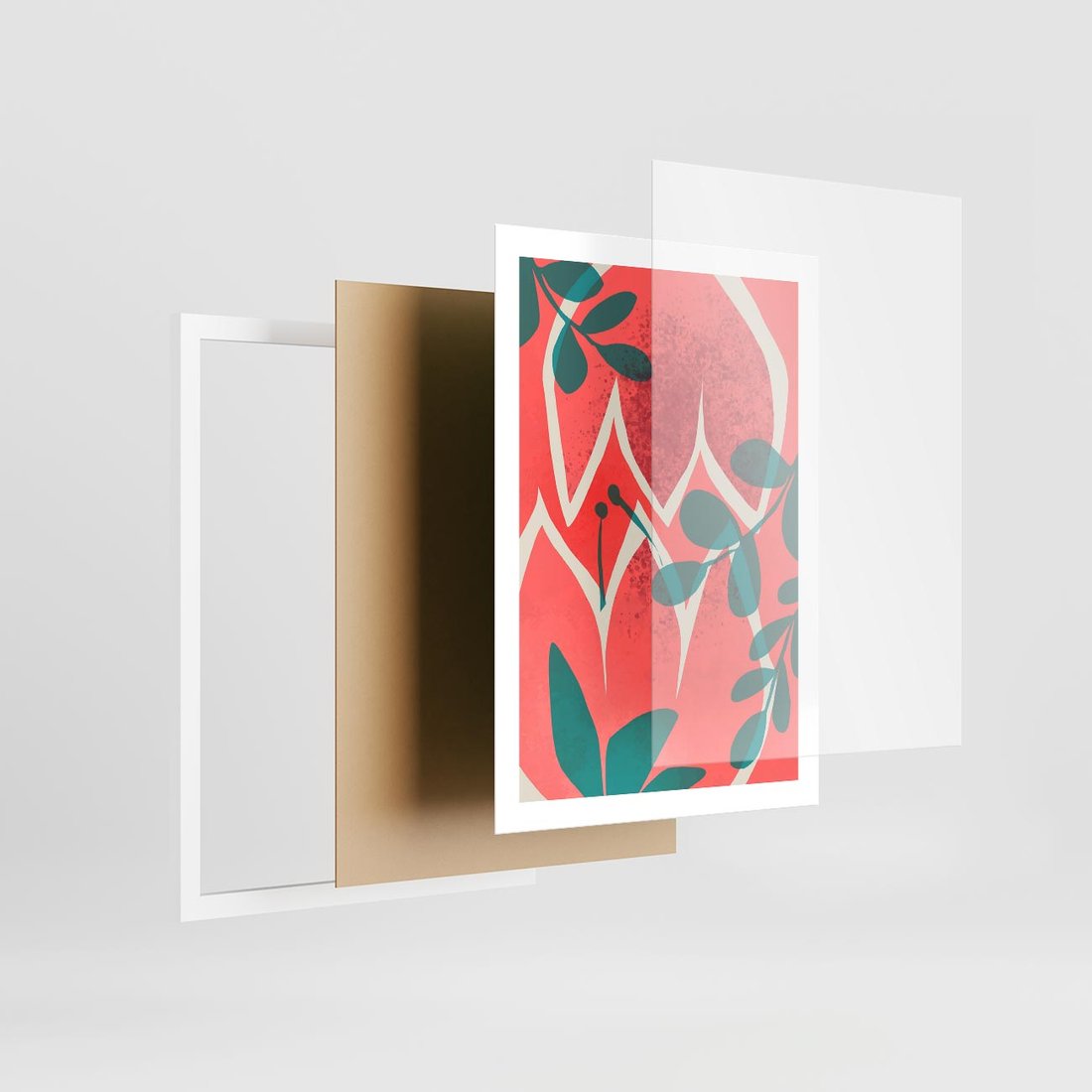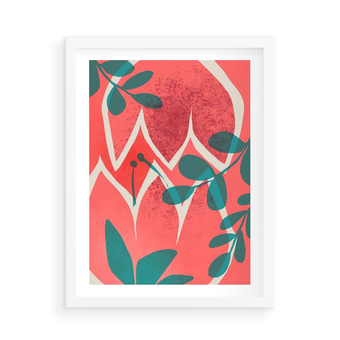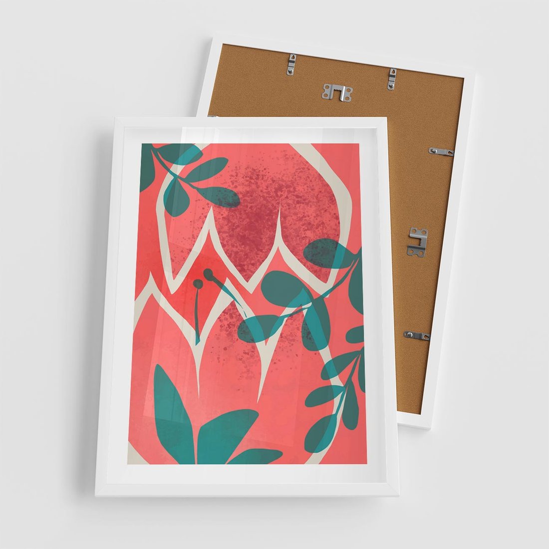 Nowoczesny plakat z abstrakcyjnymi kwiatami w odcieniach różu, emanujący nowoczesną sztuką i pięknem natury.