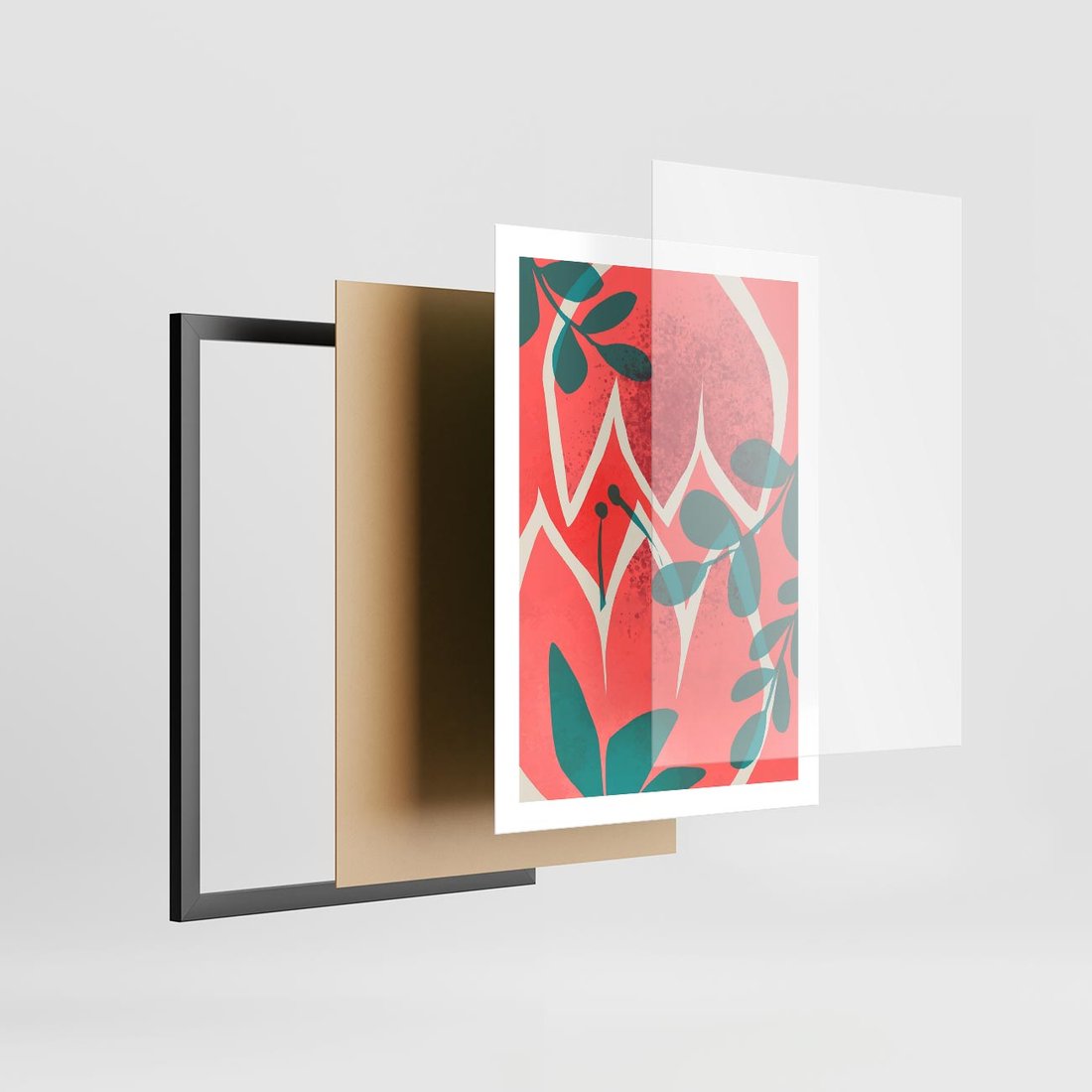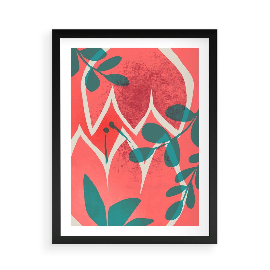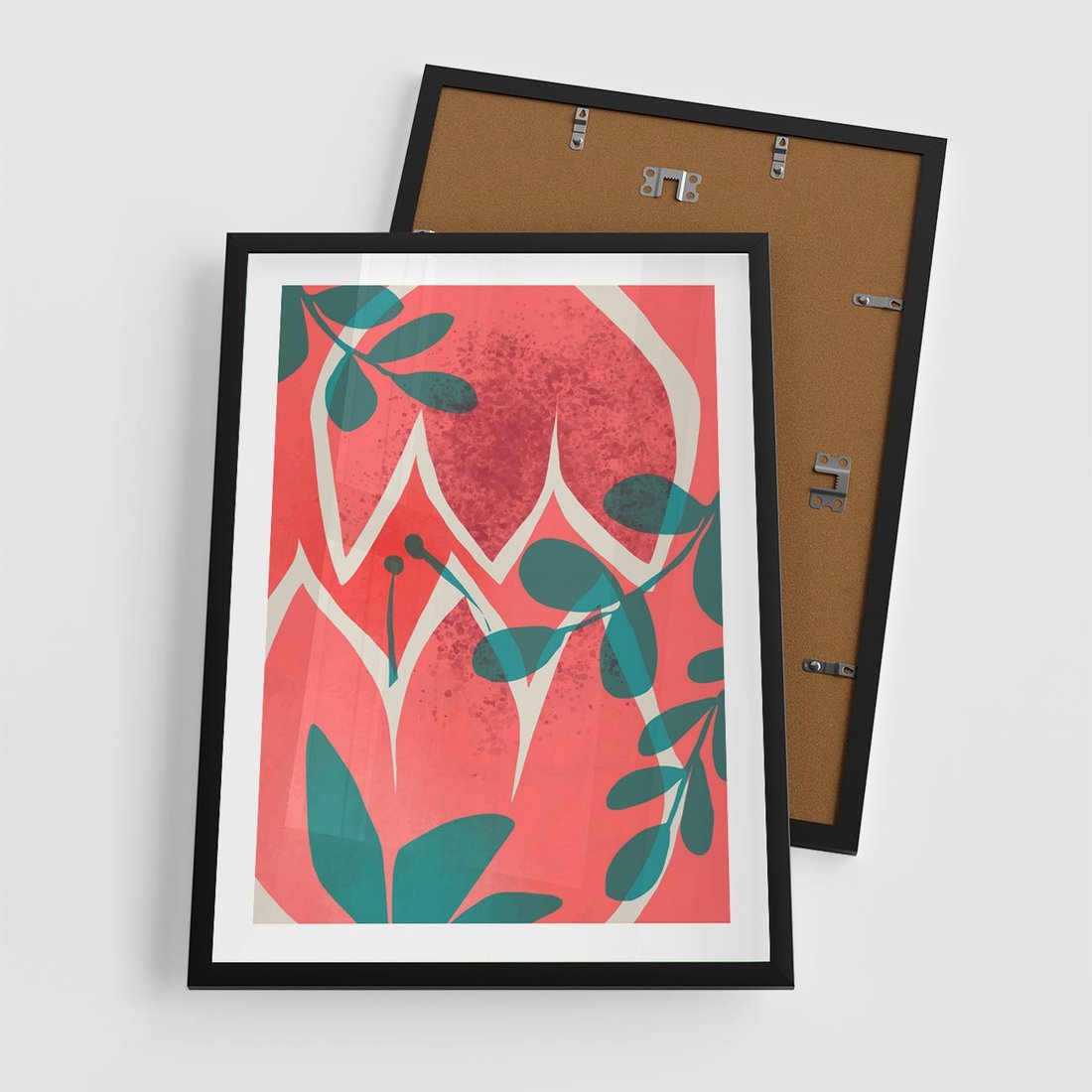 Nowoczesny plakat z abstrakcyjnymi kwiatami w odcieniach różu, emanujący nowoczesną sztuką i pięknem natury.