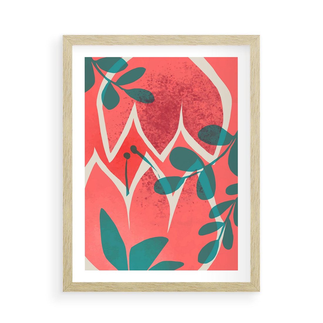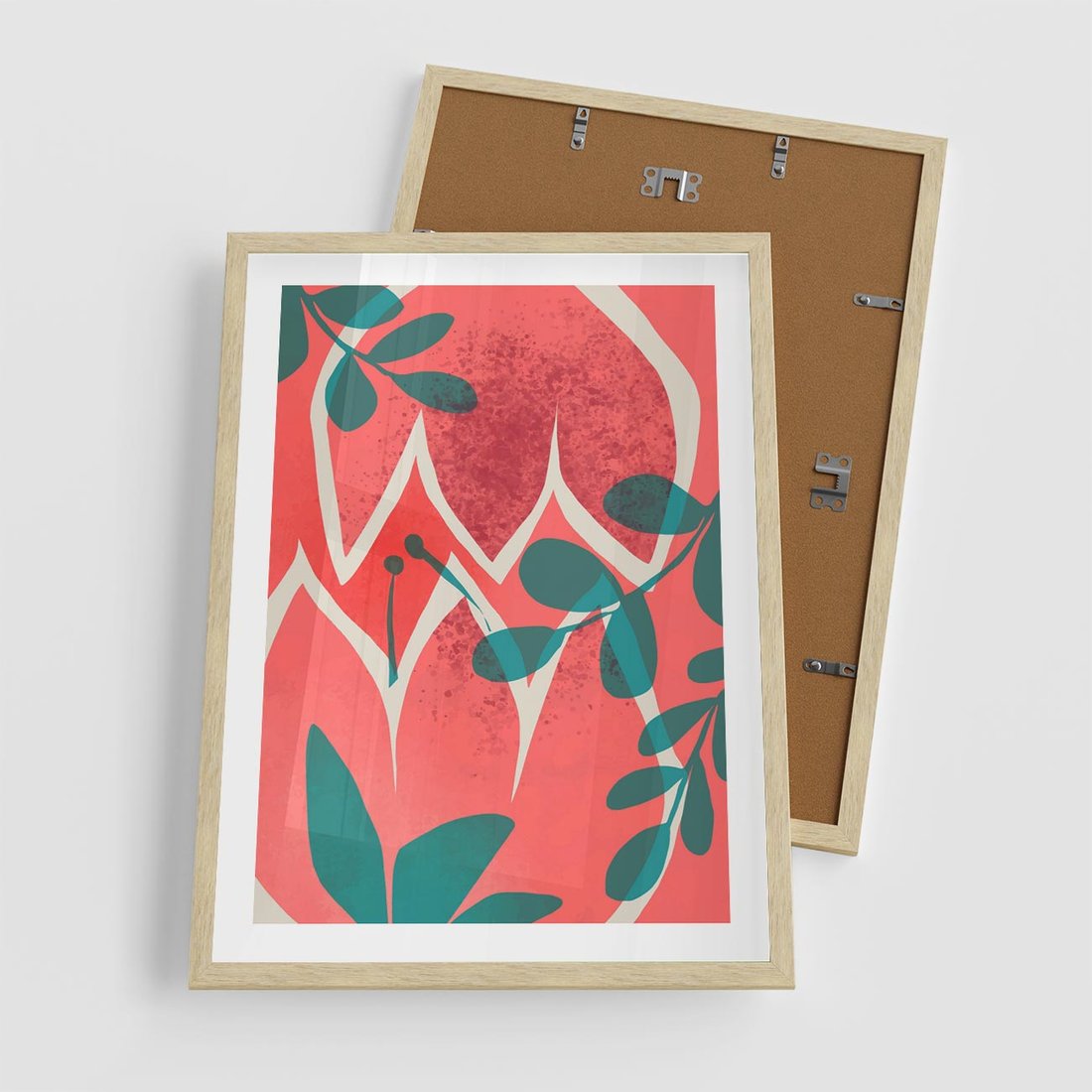 Nowoczesny plakat z abstrakcyjnymi kwiatami w odcieniach różu, emanujący nowoczesną sztuką i pięknem natury.