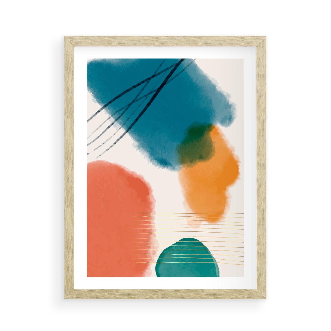 Nasz plakat to dynamiczna abstrakcja z kolorowymi plamami w akwarelowej technice, zdobiona subtelnie złotymi elementami. To artystyczne dzieło przynosi radość i energię do wnętrza, wprowadzając unikalny akcent artystyczny.