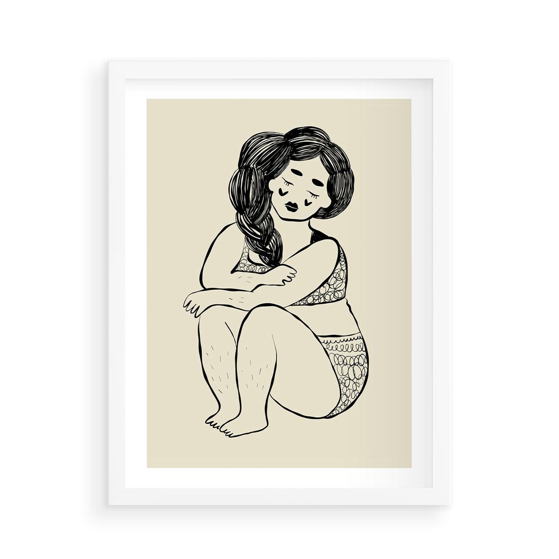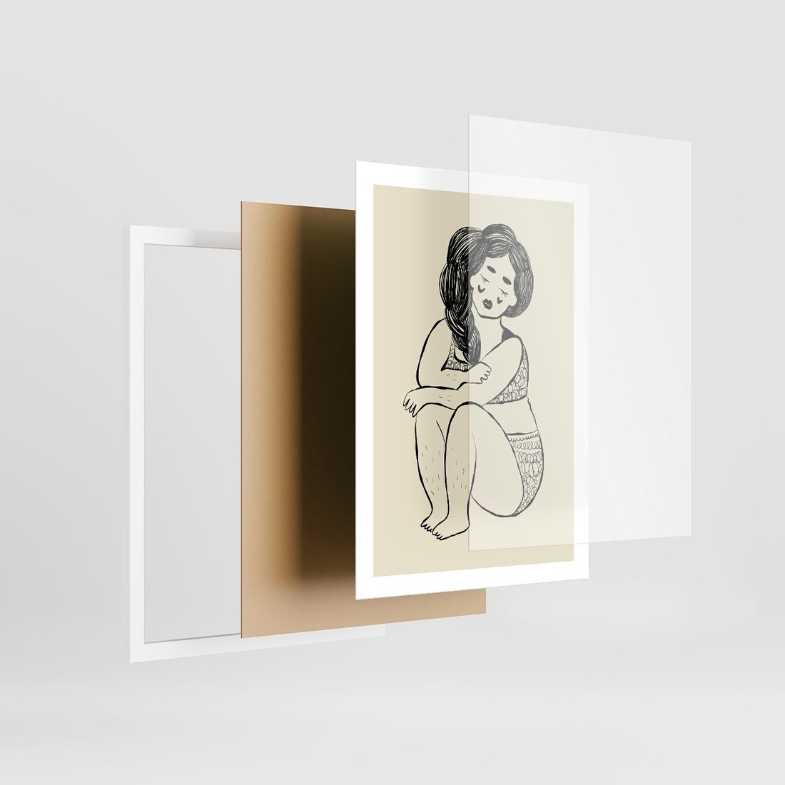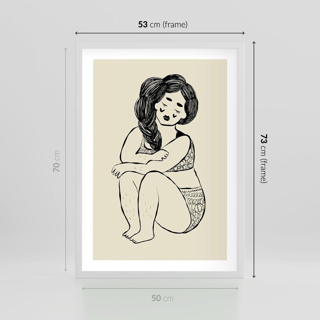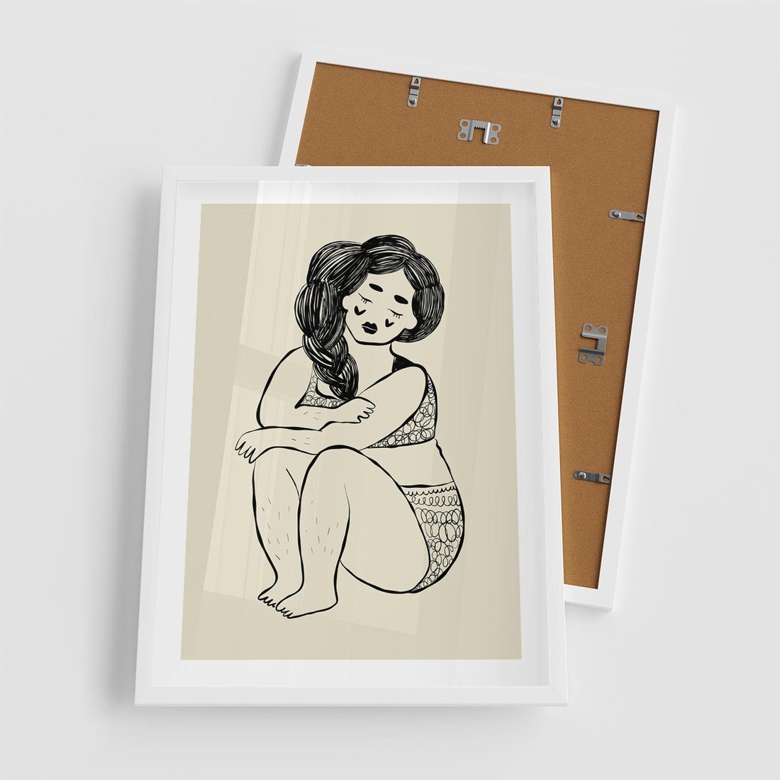 Ten nowoczesny minimalistyczny rysunek ukazuje delikatną siłę kobiecej postaci w bieliźnie, podkreślając ważność akceptacji i piękna w jego najczystszej formie.