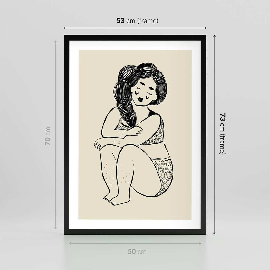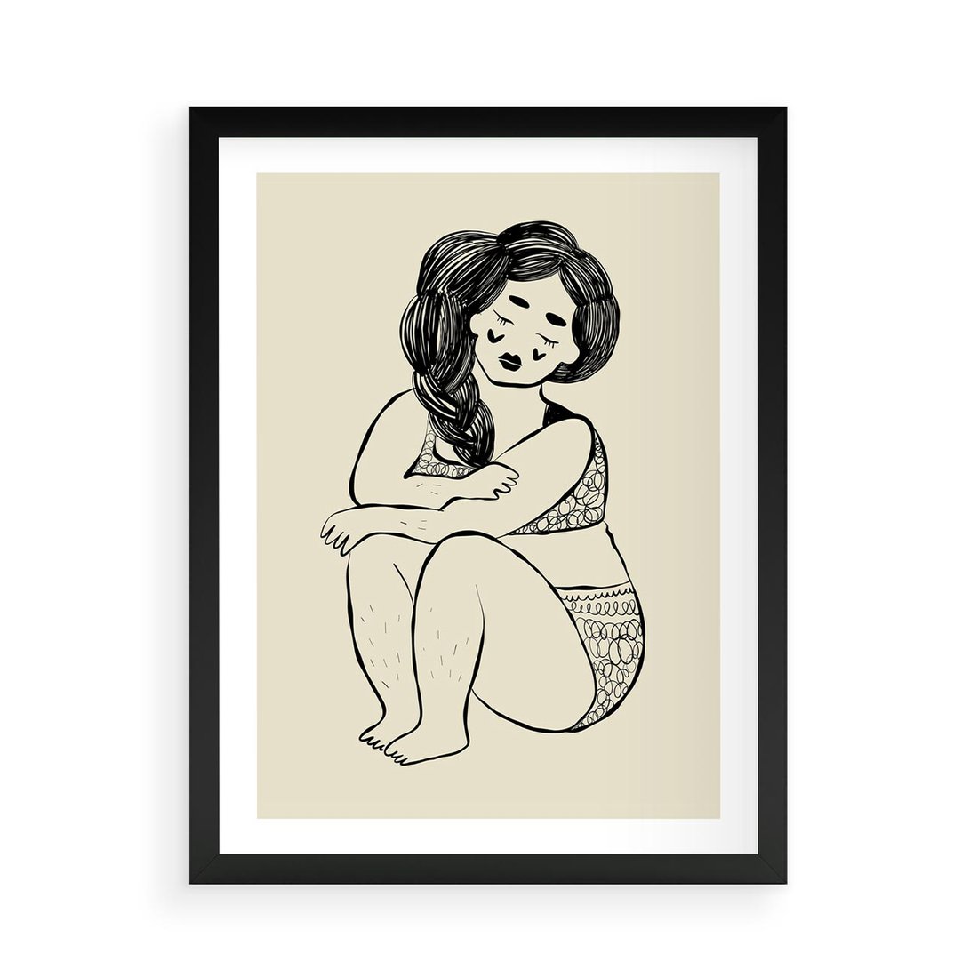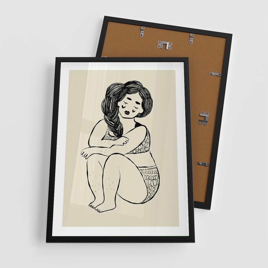 Ten nowoczesny minimalistyczny rysunek ukazuje delikatną siłę kobiecej postaci w bieliźnie, podkreślając ważność akceptacji i piękna w jego najczystszej formie.