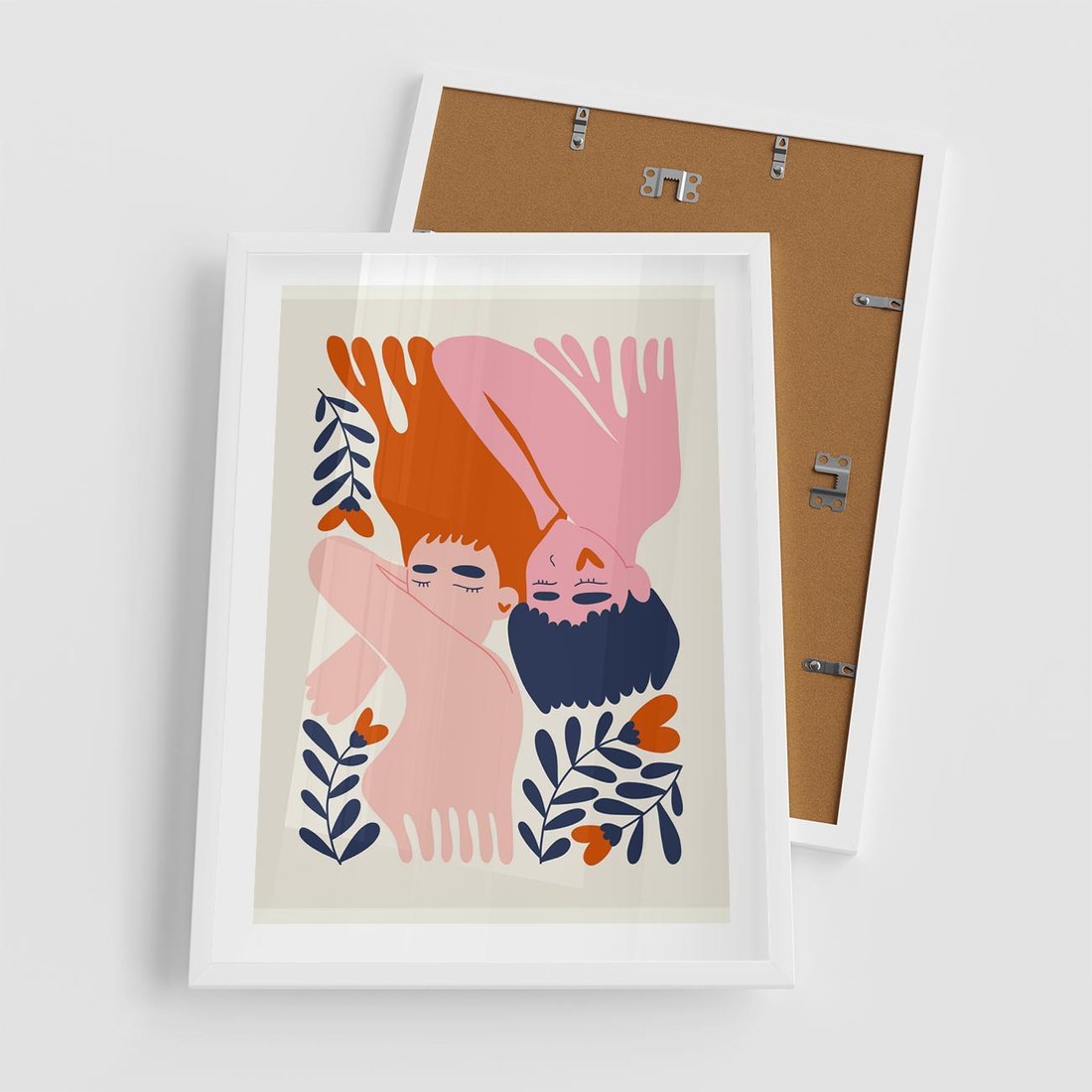 Ta nowoczesna grafika przedstawiająca parę zakochanych kobiet oddaje piękno miłości. "Miłość w Dwóch Sercach" to wyjątkowe spojrzenie na uczucie, które pokazuje, że miłość jest piękna bez względu na różnice. Obraz ten wprowadzi do wnętrza subtelny akcent emocji, jednocześnie zachowując nowoczesny styl graficzny.
