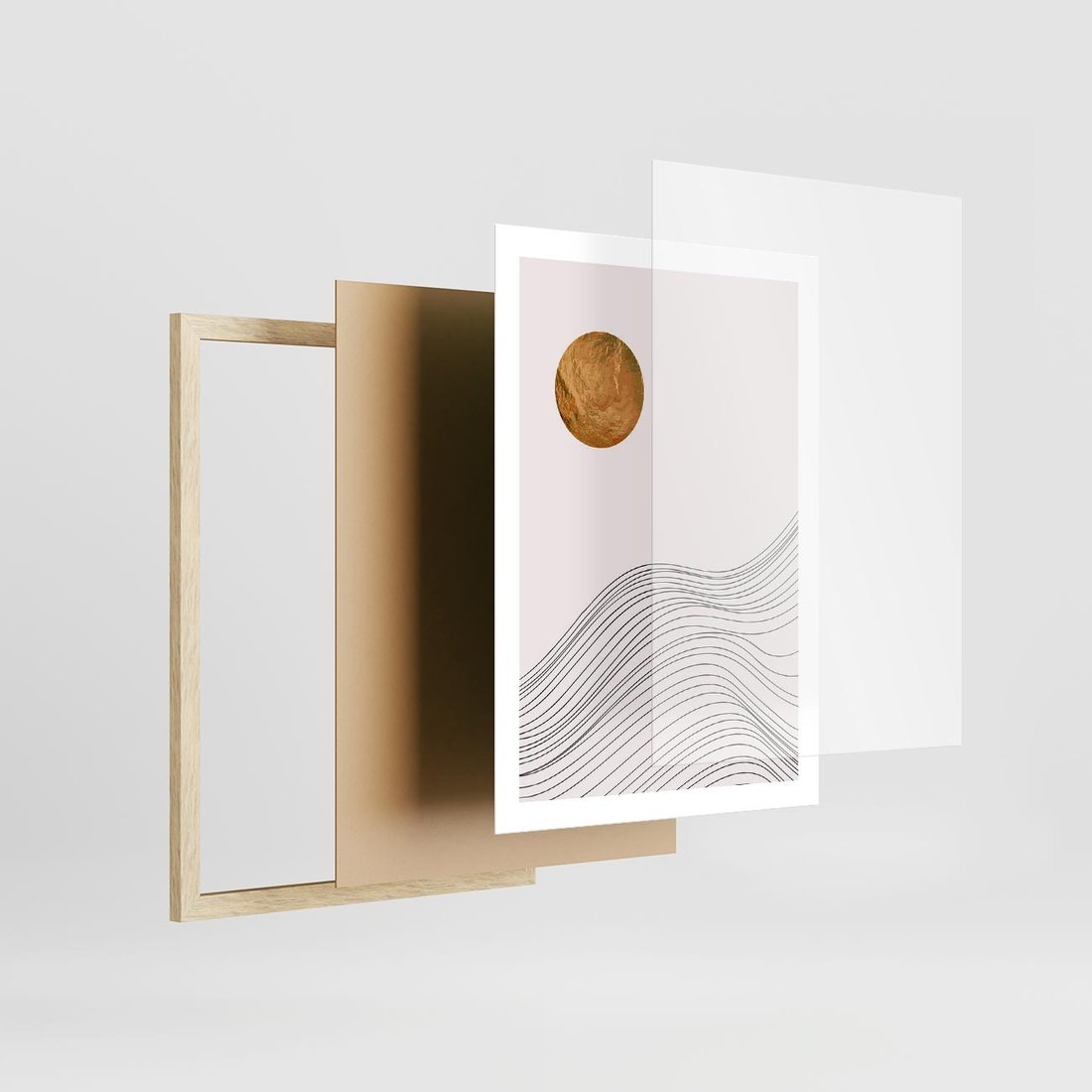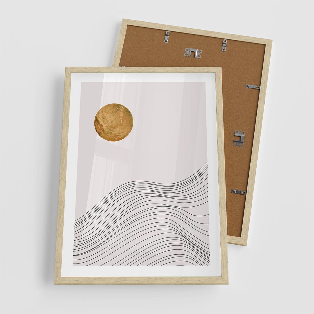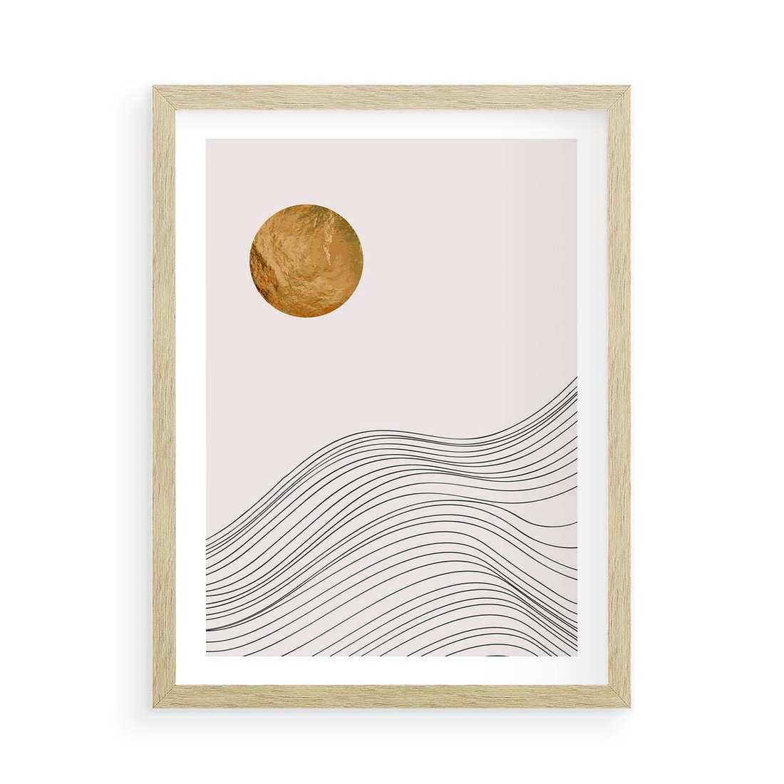 Plakat w ramie 50x70 - Minimalistyczne Słońce: Blask i Złoto - grafika, minimalizm - rama drewno