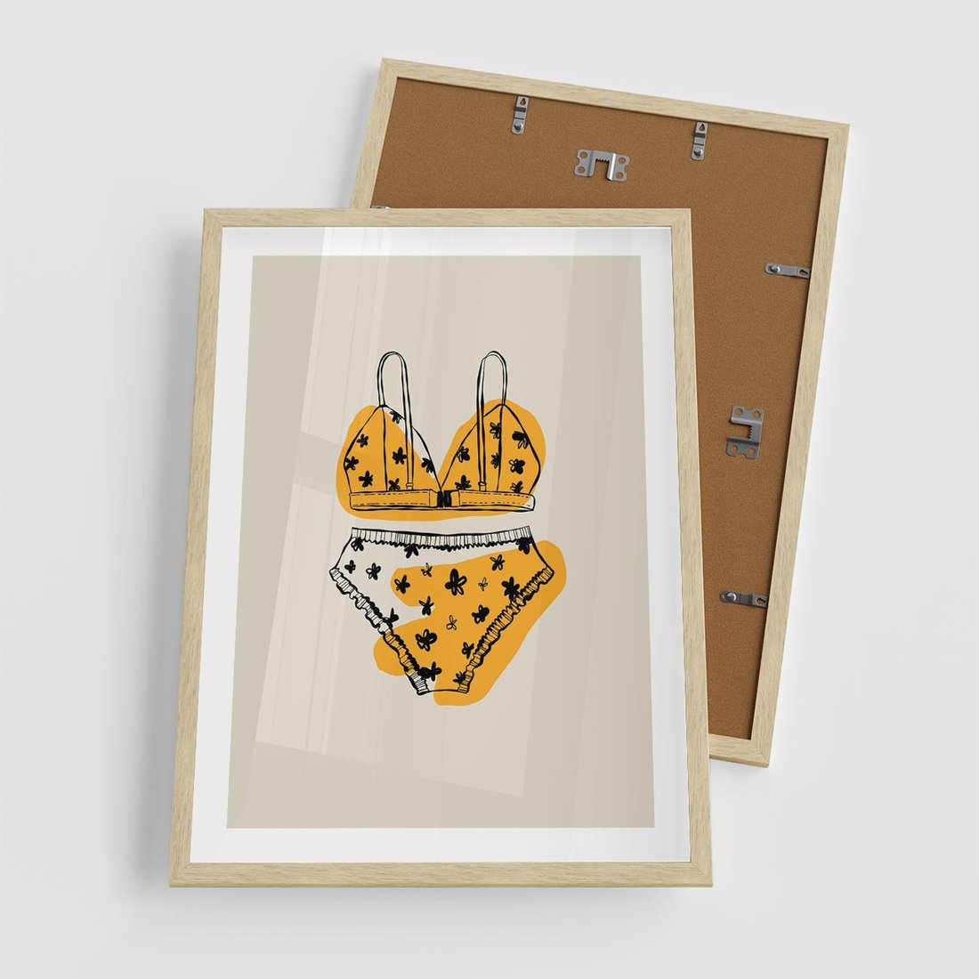 Obraz przedstawia minimalistyczną grafikę w postaci szkicu bielizny. Ta kompozycja jest elegancka i idealnie pasuje do wnętrz o nowoczesnym designie.