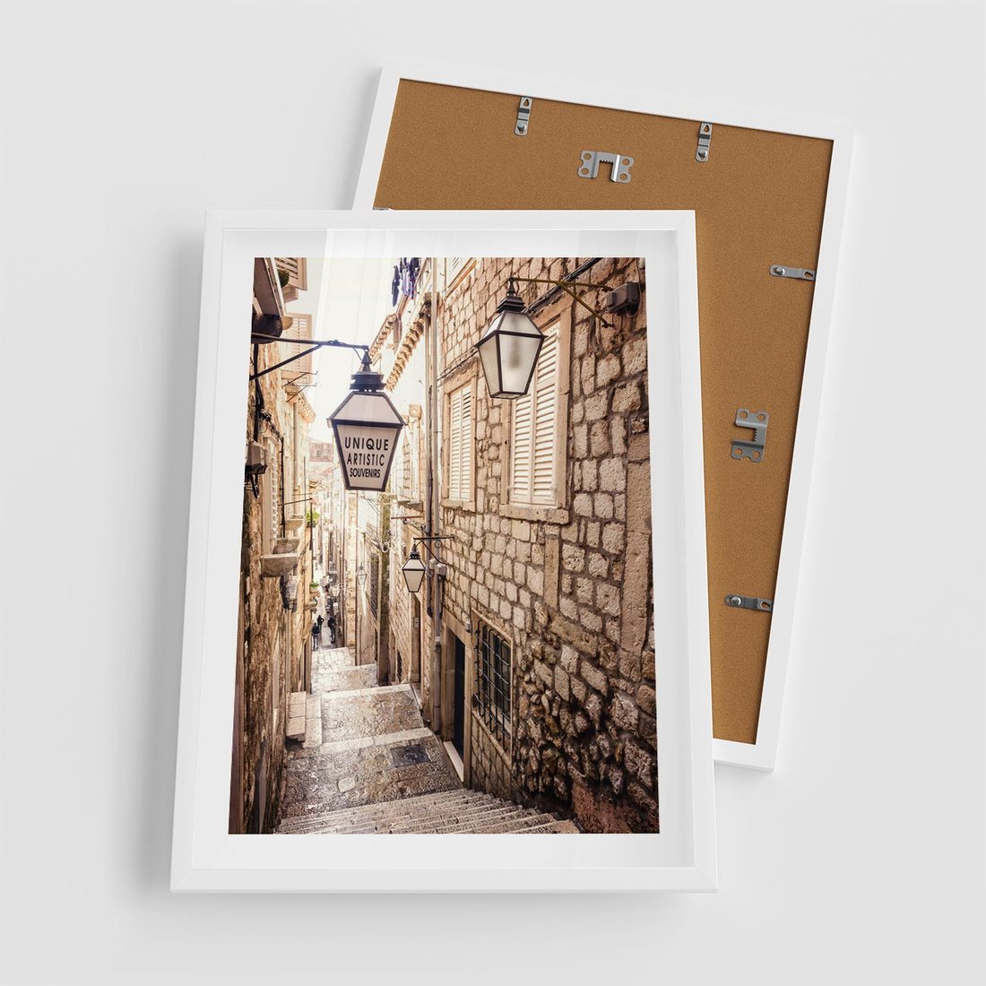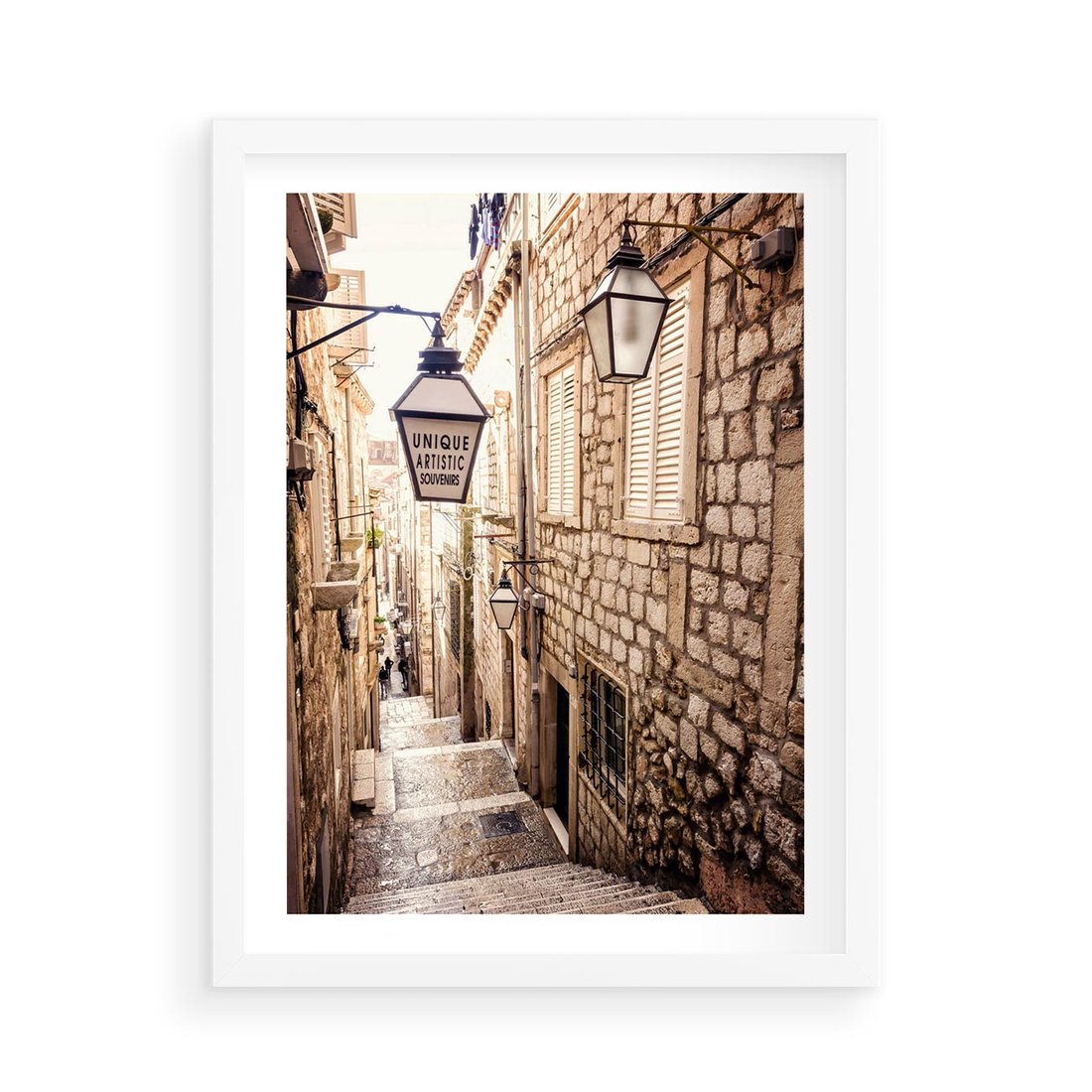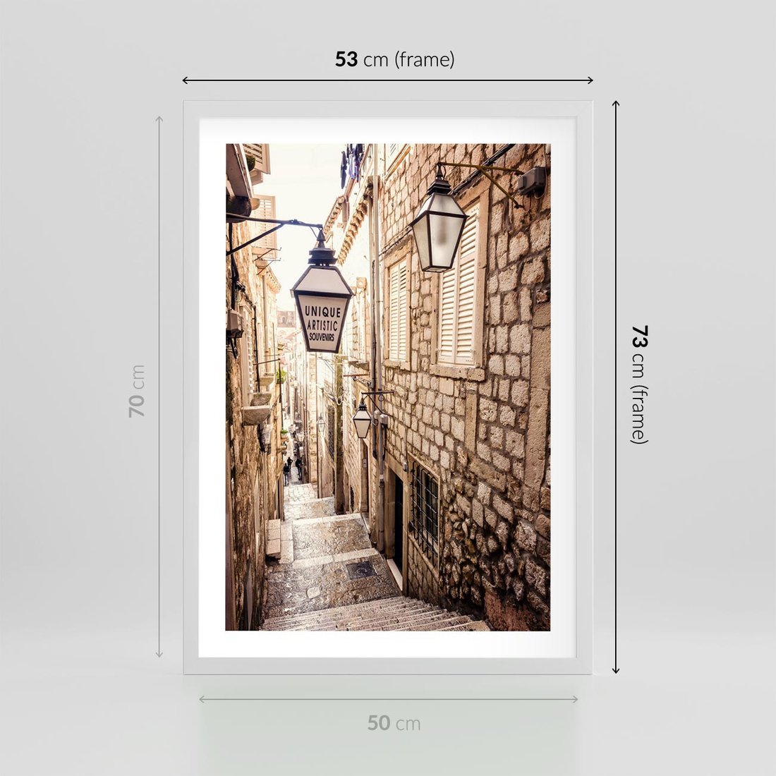 Plakat w ramie 50x70 - mistyczna podróż - uliczka, perspektywa - rama biała