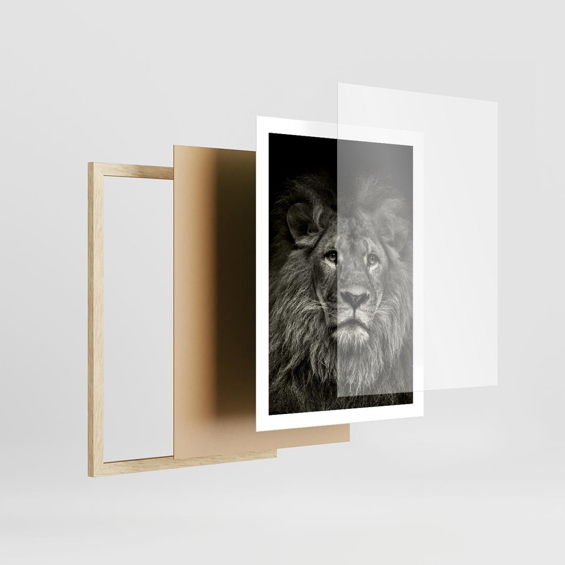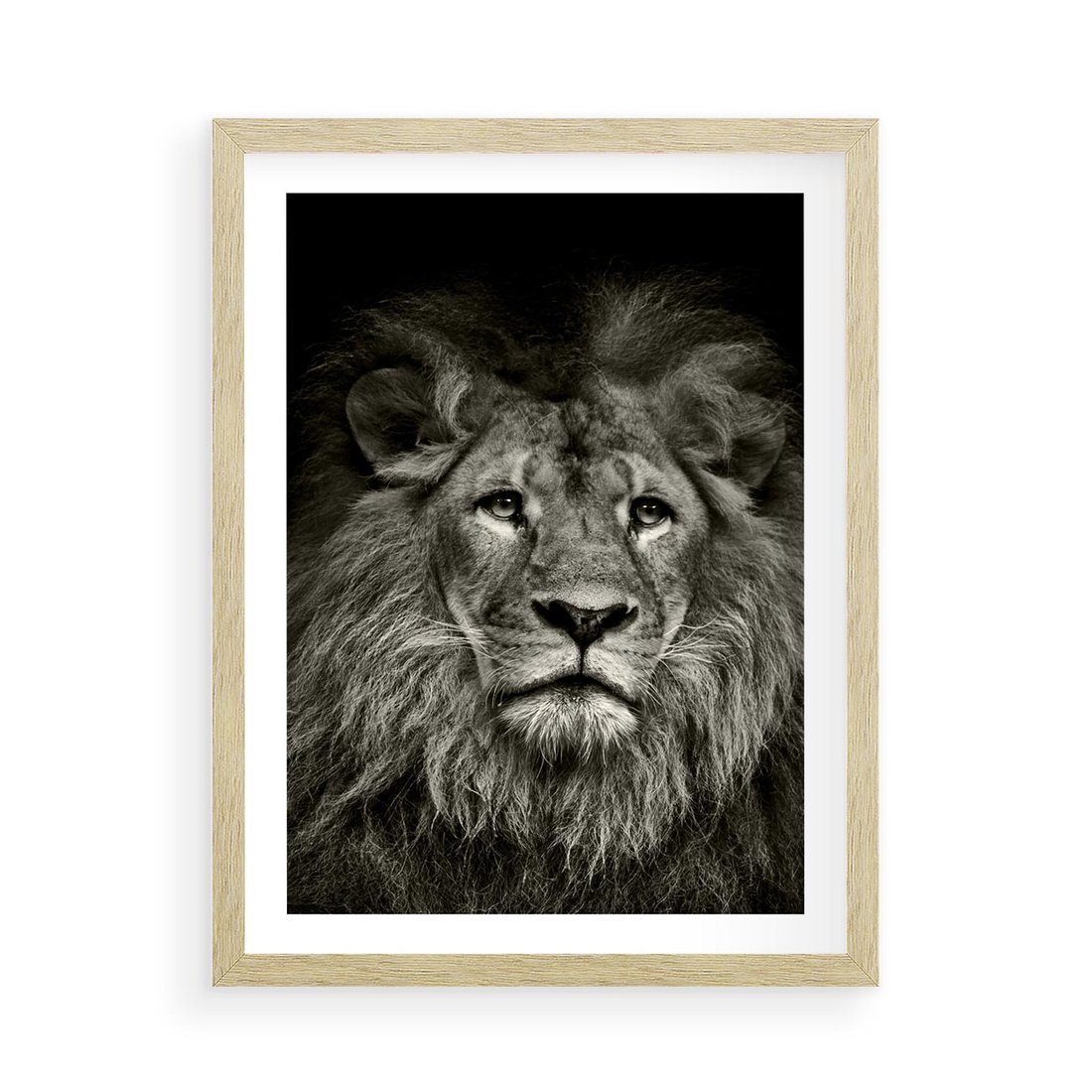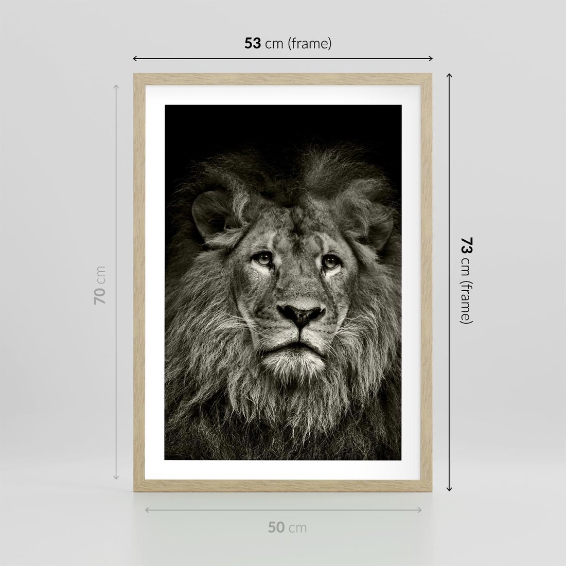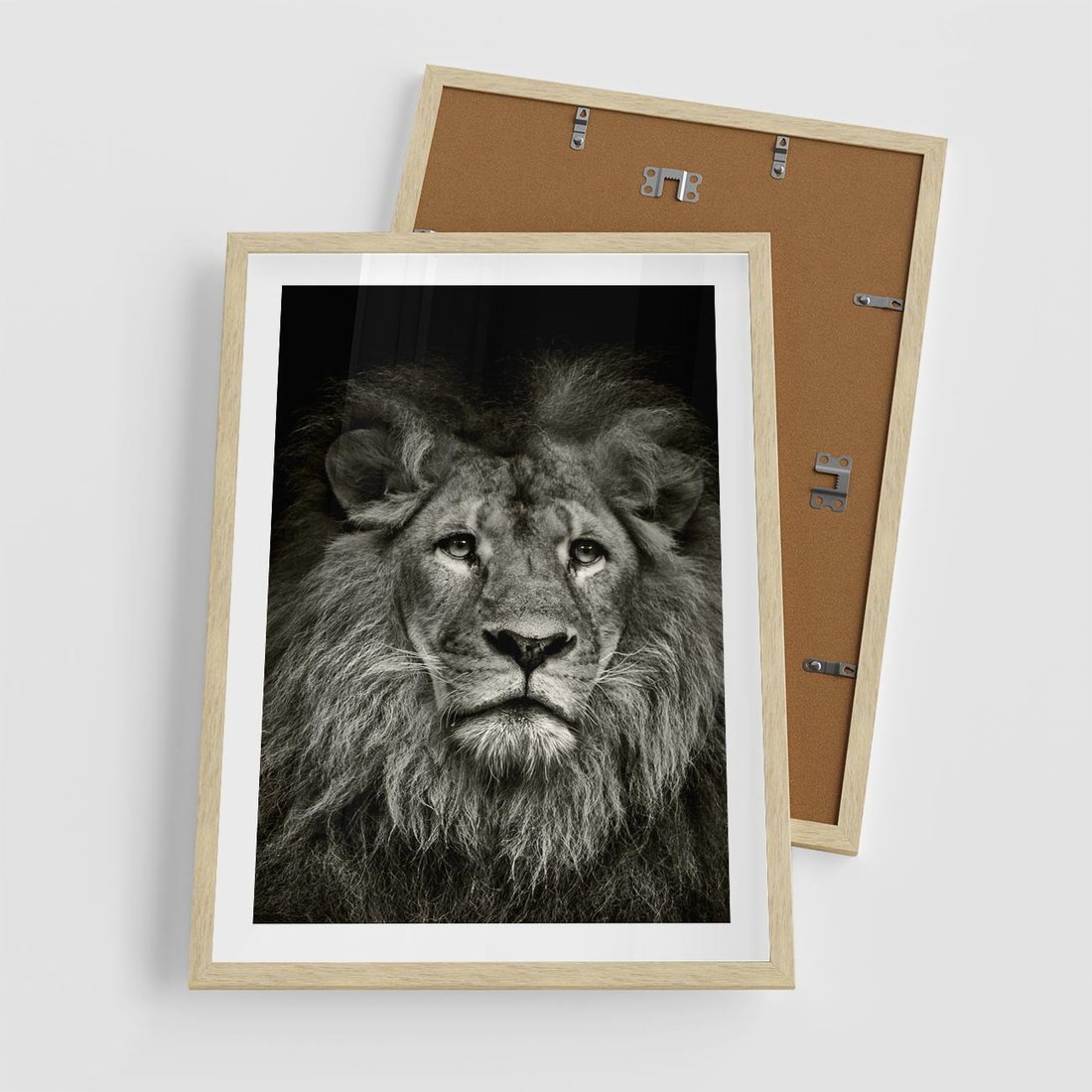 Plakat w ramie 50x70 - Moc lewego spojrzenia - lew, czarno - rama drewno