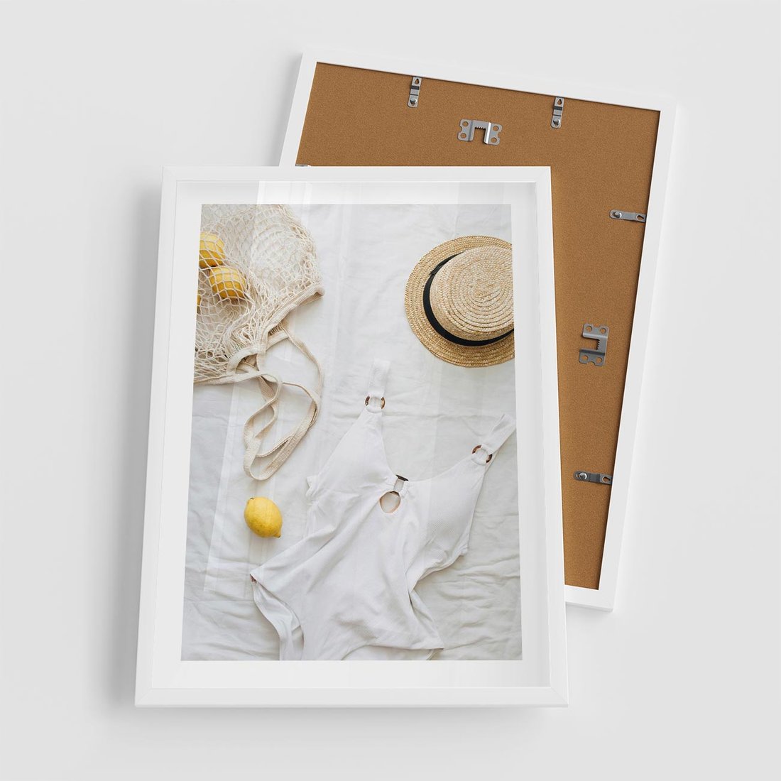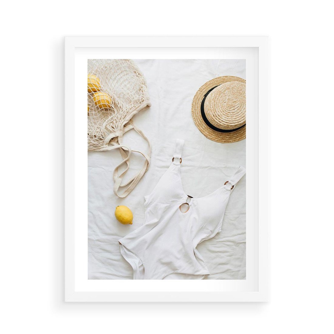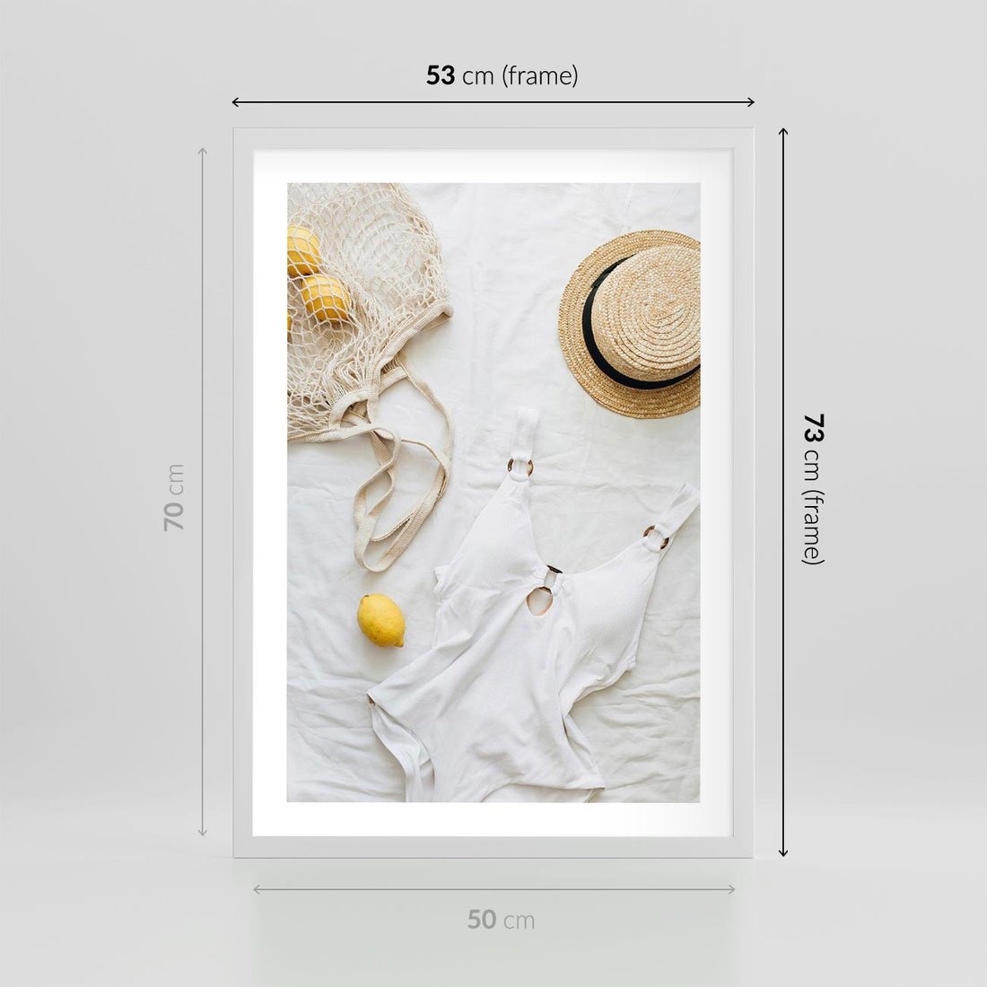Plakat w ramie 50x70 - Moda na Wakacje: Cytrynowy Urok - kompozycja letnia, fashion - rama biała