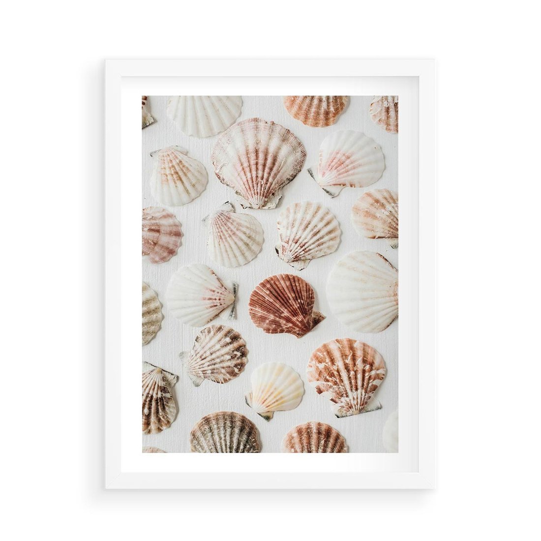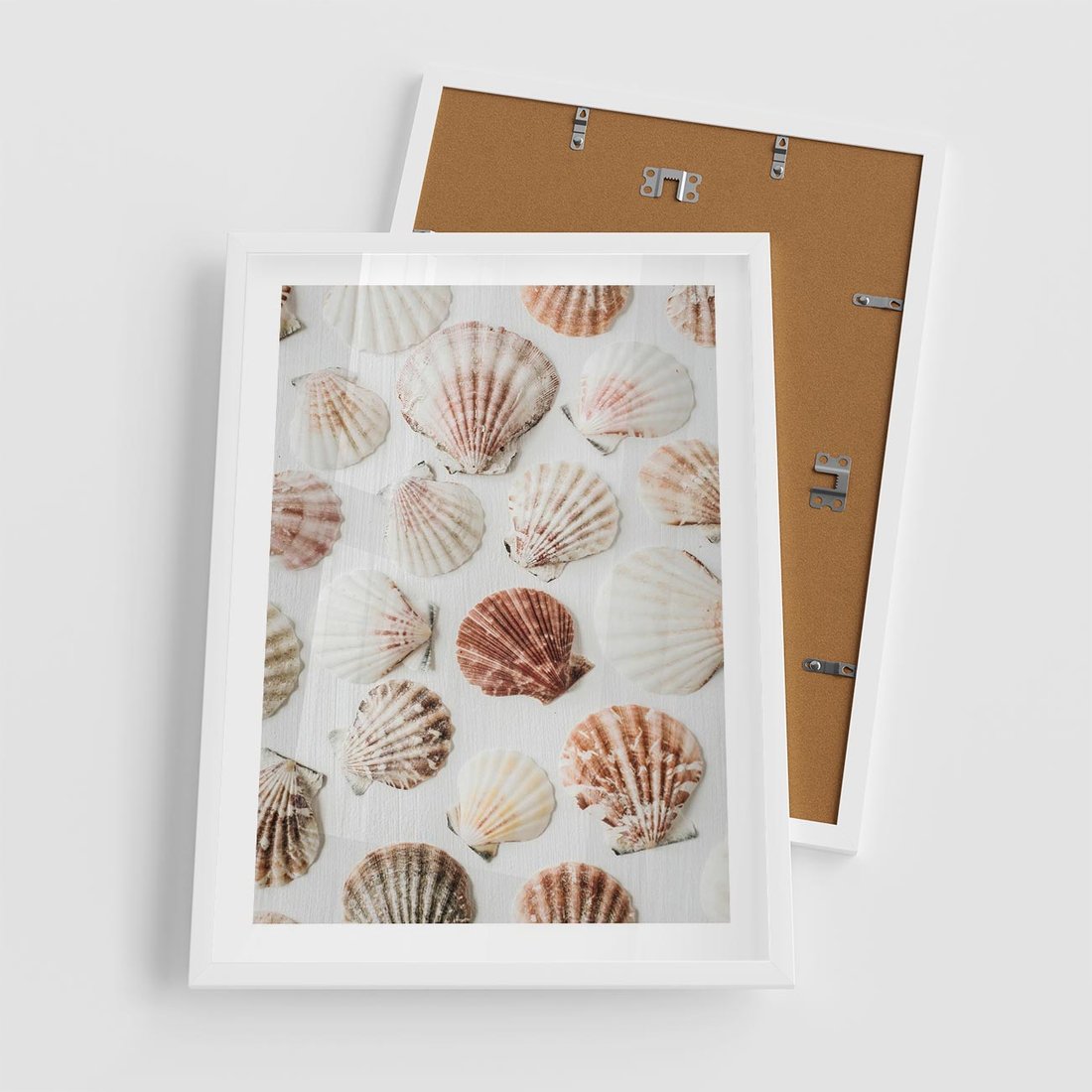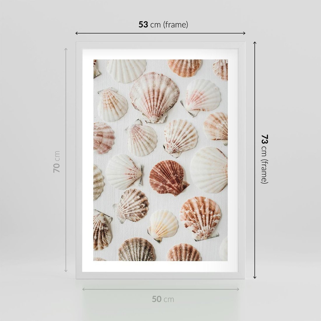 Plakat w ramie 50x70 - Morska Delikatność: Muszelki na Białym Tle - kompozycja, morskie muszelki na białym tle - rama biała