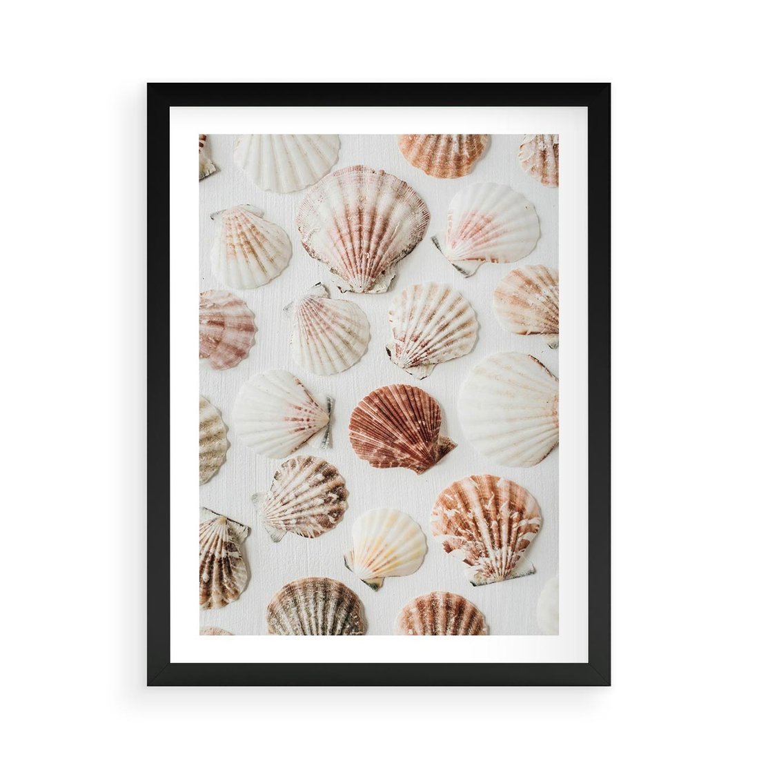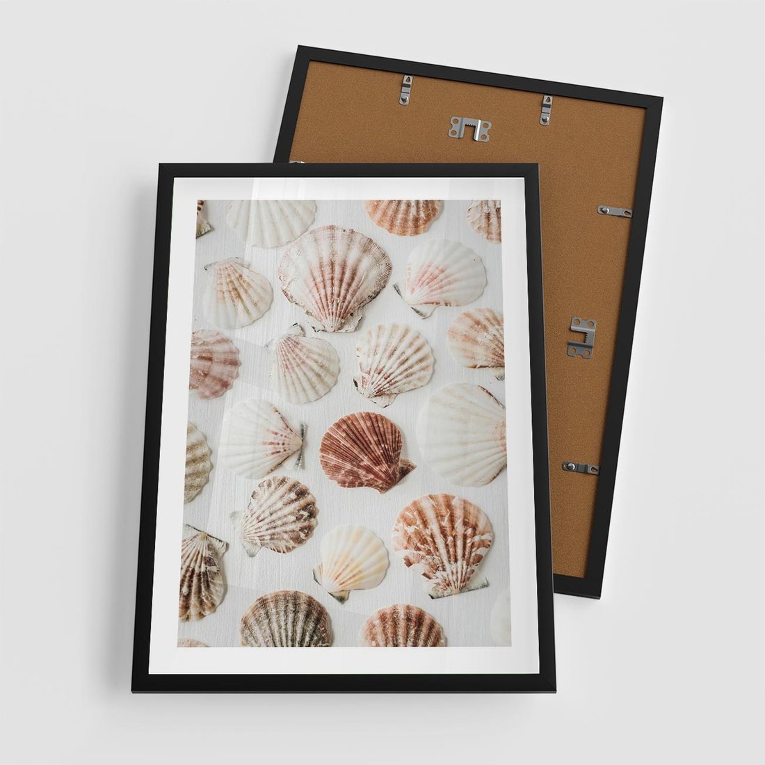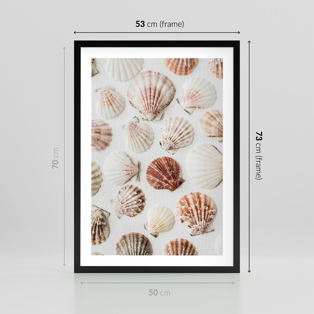 Plakat w ramie 50x70 - Morska Delikatność: Muszelki na Białym Tle - kompozycja, morskie muszelki na białym tle - rama czarna