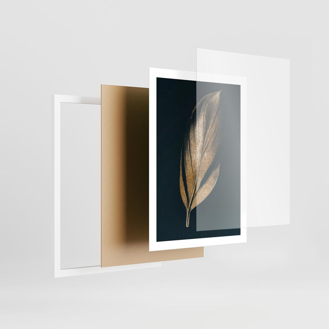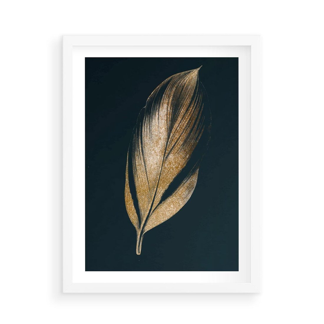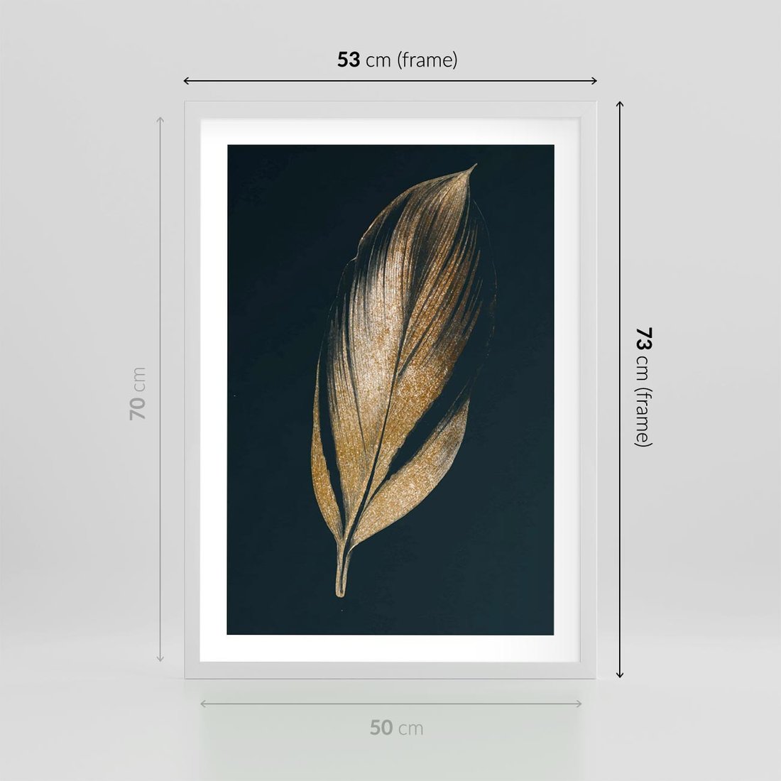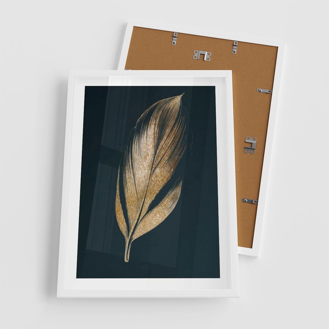 Plakat w ramie 50x70 - Mroczne Złoto - nowoczesna grafika, złoty liść na czarnym tle - rama biała