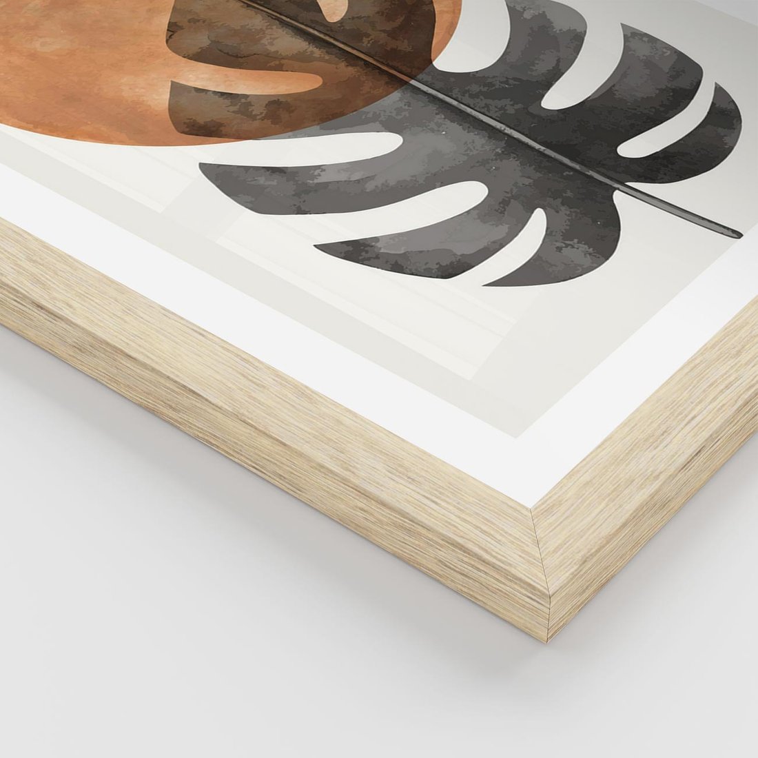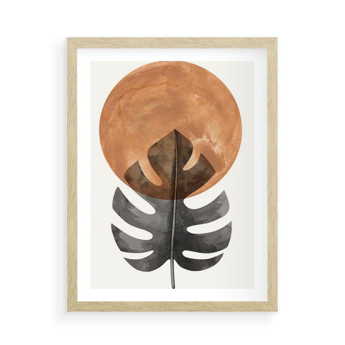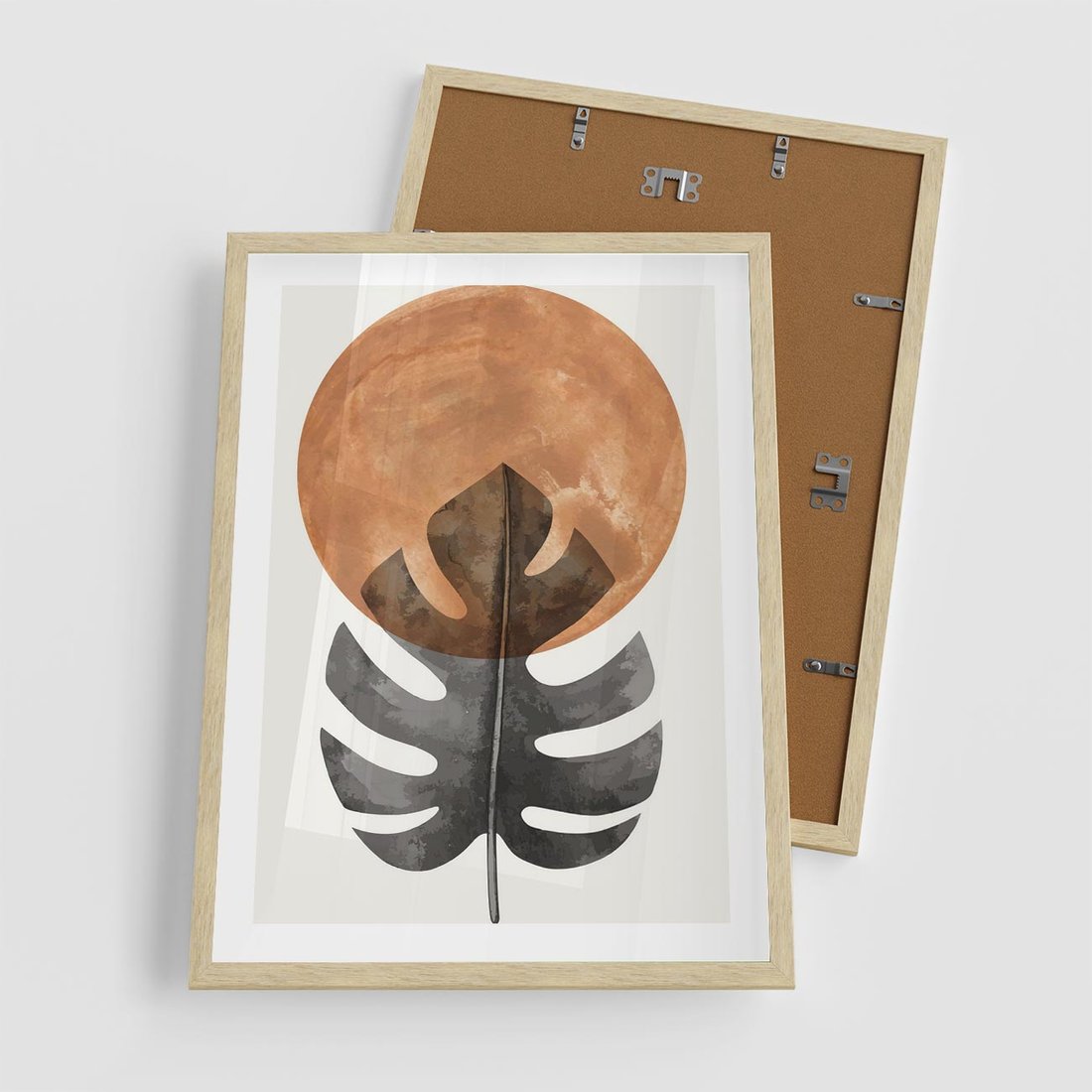 Nasza grafika to połączenie natury i nowoczesnego designu. Ten czarno-biały szkic przedstawia elegancki liść monstery w towarzystwie miedzianego koła, co tworzy minimalistyczną i stylową kompozycję. To idealna dekoracja, aby wprowadzić do swojego wnętrza harmonię między naturą a sztuką.