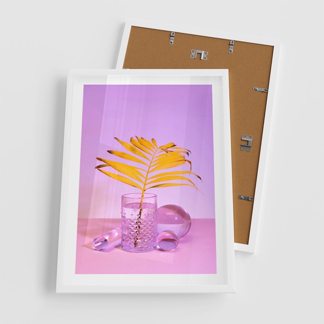 Plakat w ramie 50x70 - Neonowy Liść Palmy na Fotografii - neonowa fotografia, liść palmy w szklance - rama biała