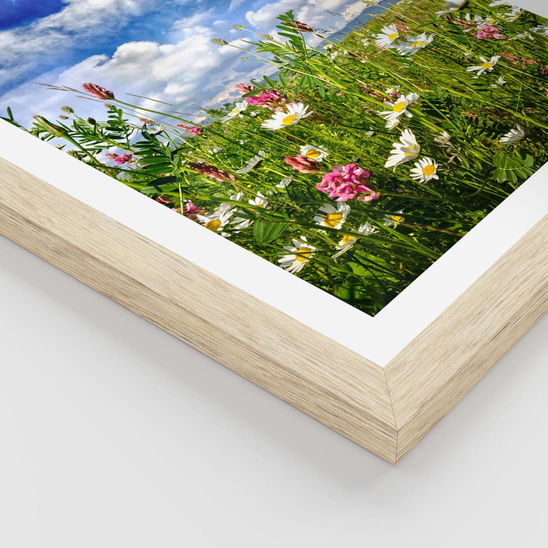 Plakat w ramie 50x70 - Niebiańska łąka pełna kwiatów - łąka, niebo - rama drewno