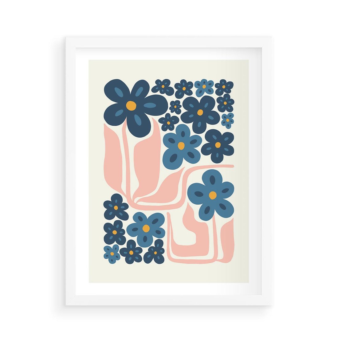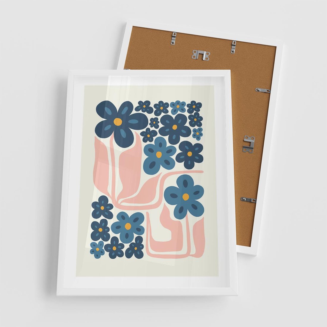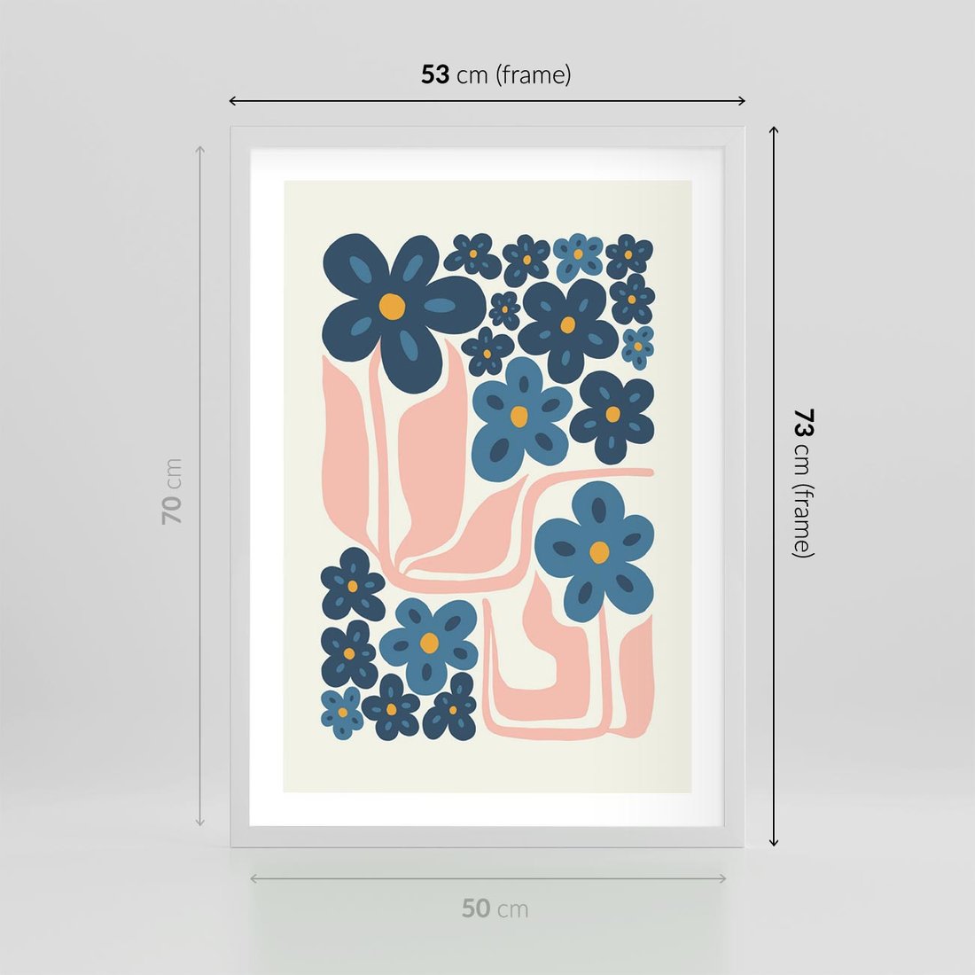 Plakat w ramie 50x70 - Niebieskie Refleksje - niebieskie kwiaty, niezapominajki - rama biała