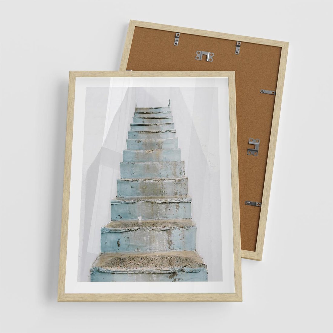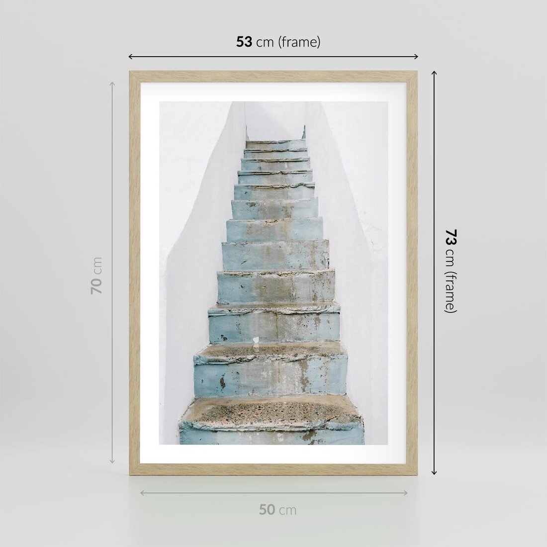 Plakat w ramie 50x70 - Niebieskie Schody Santorini - stare kamienne schody, niebieskie schody - rama drewno