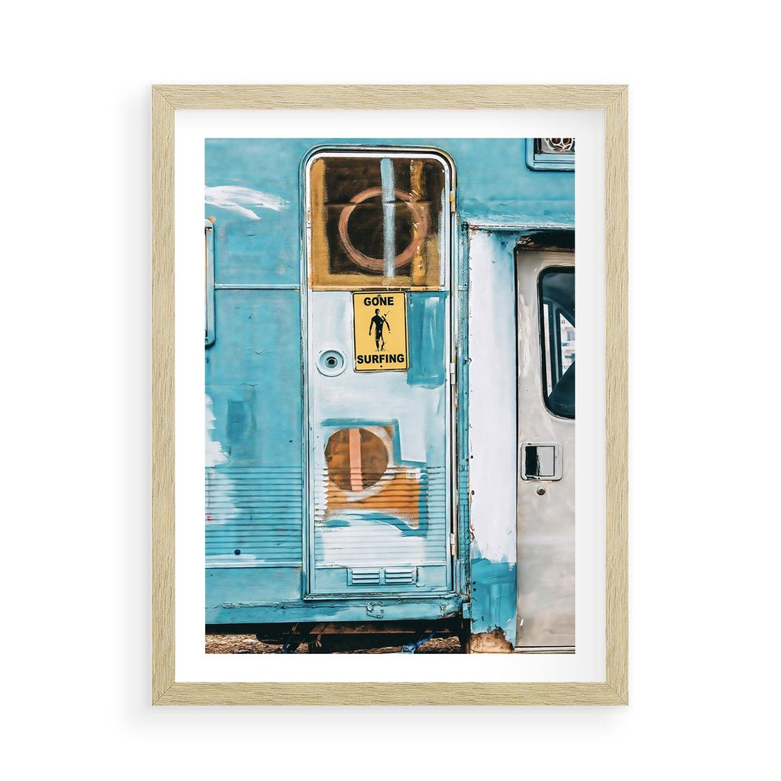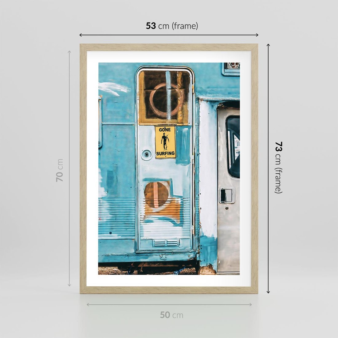 Plakat w ramie 50x70 - Nostalgiczna Podróż - stara przyczepa kempingowa, niebieskie kolory - rama drewno