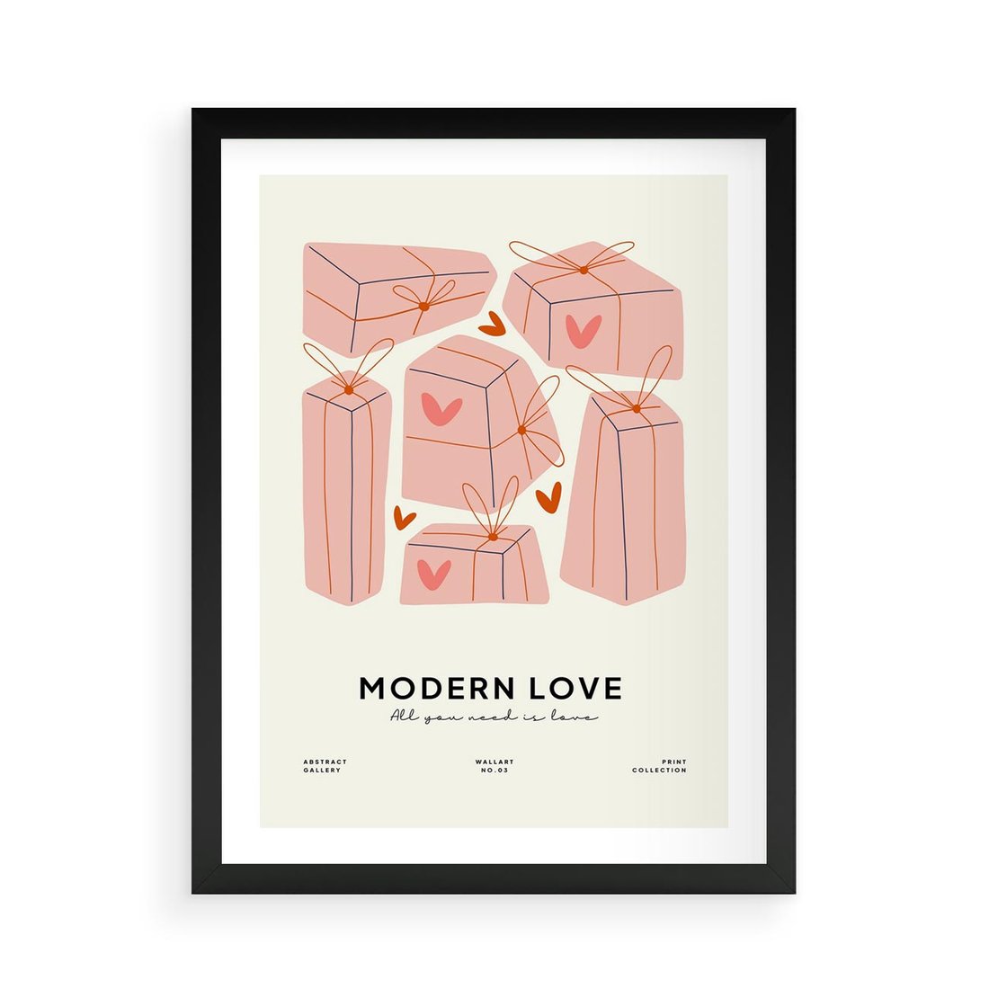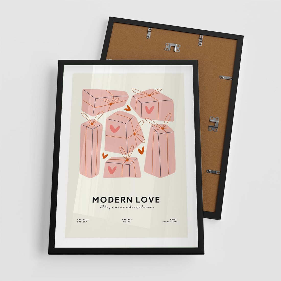 Ta nowoczesna grafika w pastelowych odcieniach ukazuje serduszka i prezenty, tworząc dynamiczną kompozycję. "Nowoczesna Miłość" to hołd dla uczucia w stylu współczesnym, z subtelną typografią "Modern Love". Obraz ten wniesie do wnętrza dawkę radości i romantyzmu, jednocześnie podkreślając nowoczesny charakter miłości.